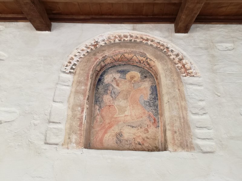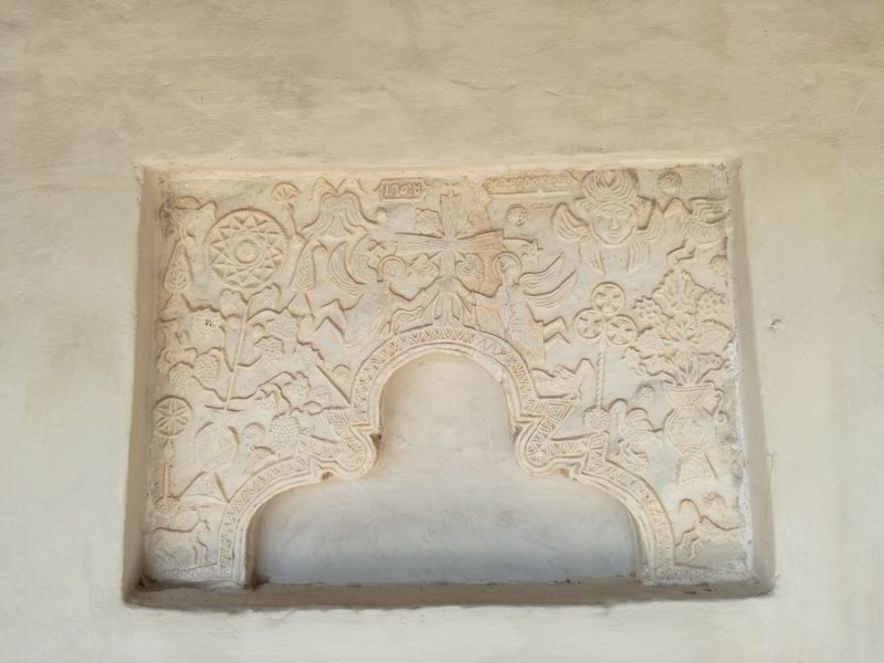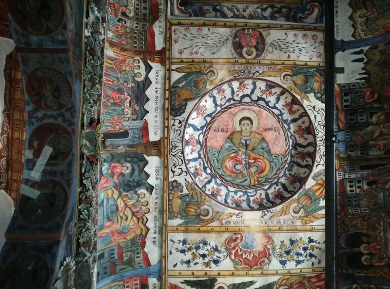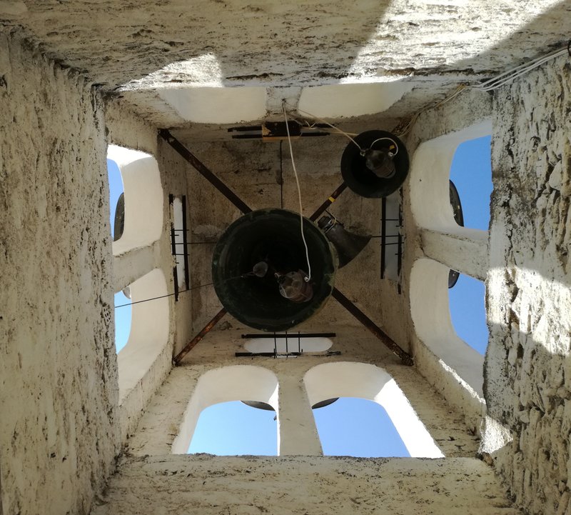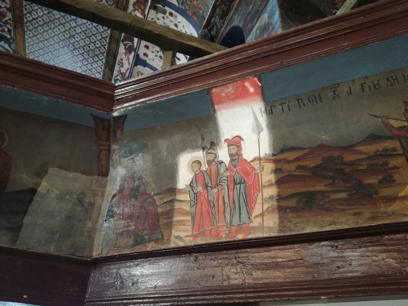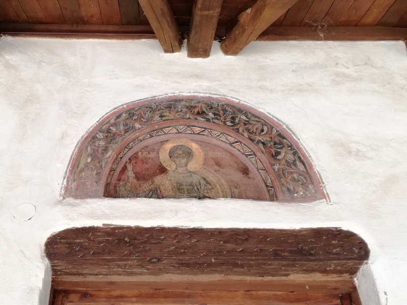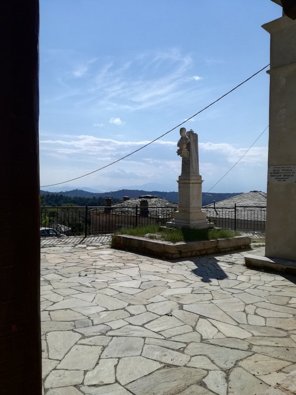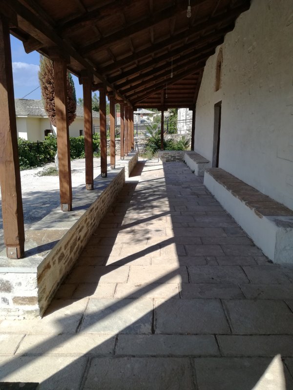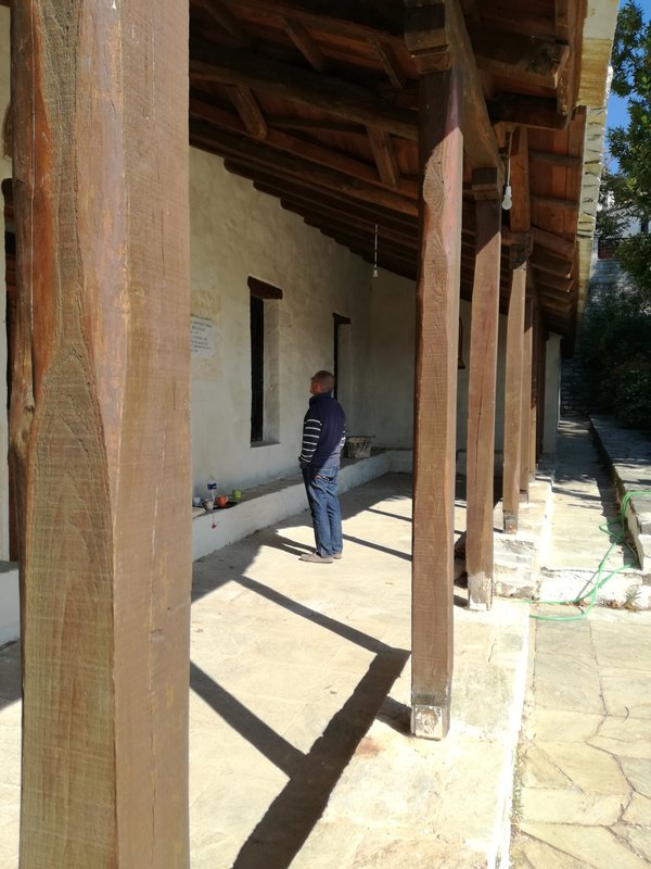 On peut manger sur la place principale de Neochori, un petit village toujours désert. Le restaurant s’appelle O Germanos – L’Allemand – parce que le Grec qui le tient est natif du village, mais a séjourné un temps certain Allemagne, à Cologne. Il parle l’allemand à la perfection, sans accent, et sert de la viande de buffle exceptionnelle, accompagnée immuablement, depuis 3 ans que nous l’avons découvert grâce à Vicky et Kostas, de brocoli, de salade choux-carottes et de frites maison. D’innombrables chats, bien nourris mais quand même à l’affût d’un reste de viande ou d’une caresse, se baladent autour des tables, à défaut de clients. Pourtant, le restaurant est toujours ouvert, et très connu. C’est le soir qu’il est fréquenté, mais le patron est là de toutes manières, il n’a rien d’autre à faire et il ouvre tous les jours dès midi et demi, comme il nous l’a expliqué. Depuis notre table, nous voyons le toit de l’église qui est en train d’être rénovée depuis fort longtemps. Nous allons voir l’intérieur, trois jeunes femmes y travaillent, une opération lente, précise, raffinée: rénovation des fresques, des sols, des corniches, des murs, l’intérieur et l’extérieur sont ressuscités avec patience et savoir-faire, tout en finesse. Pas sûre que l’argent de l’état ne devrait pas plutôt être attribué à des causes plus urgentes… mais ces trois jeunes femmes ont un salaire, l’église est belle et pourra attirer les touristes, une fois terminés les travaux. Alors qui sait, ce n’est peut-être pas plus mal.