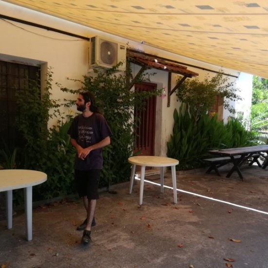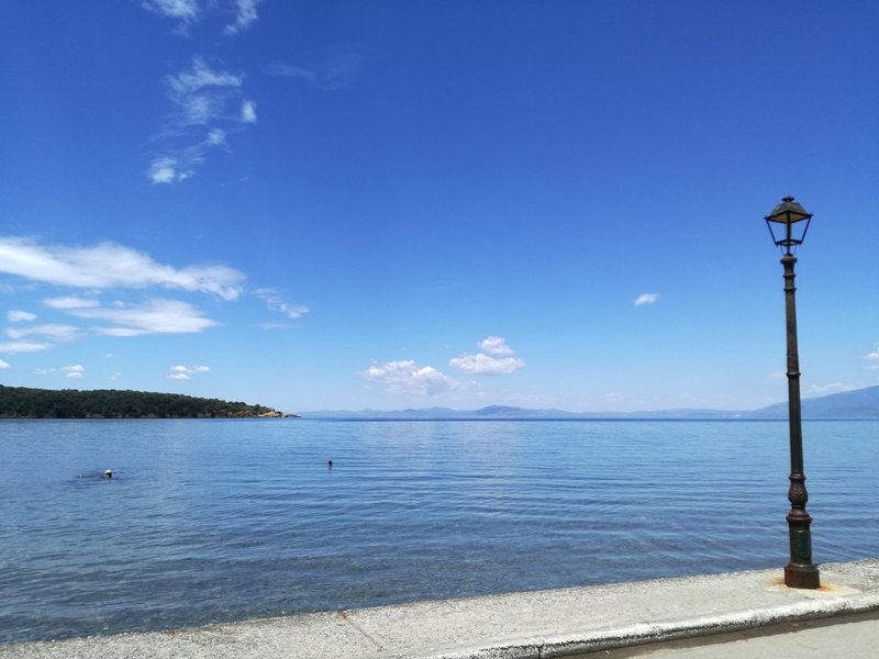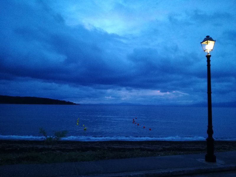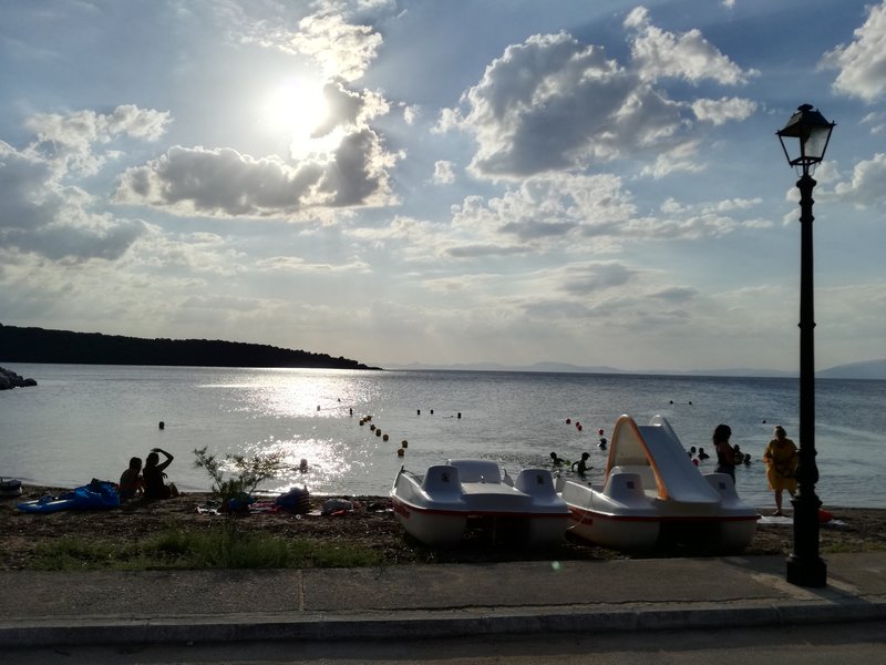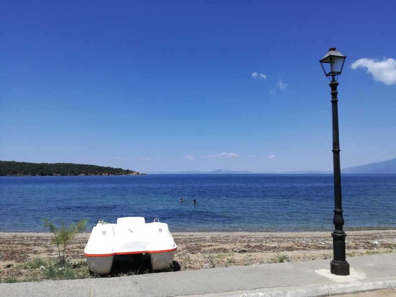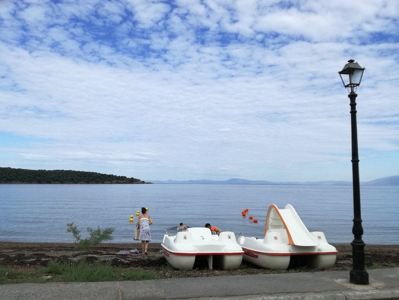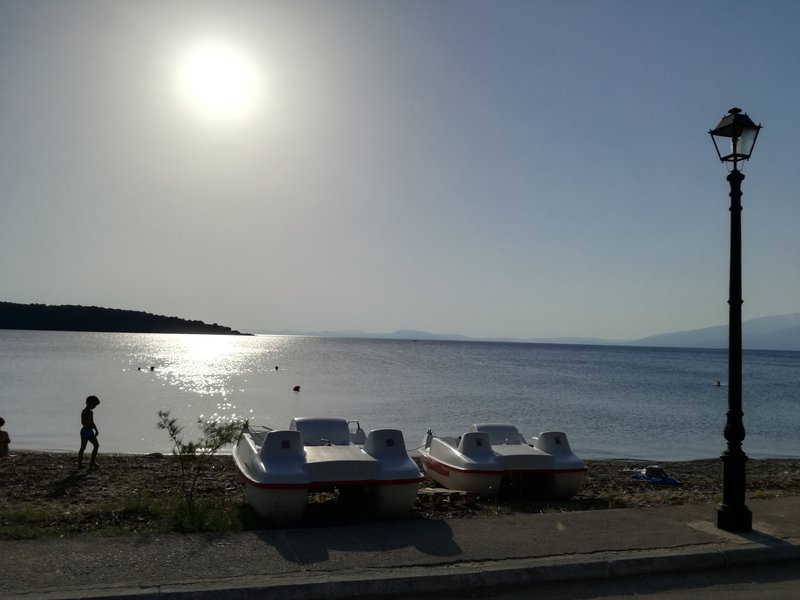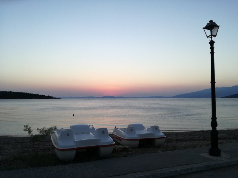 Là, je triche un peu, je prends la photo du lampadaire d’à côté, sans les pédalos, sans les baigneurs. Le calme des premiers jours pour le dernier jour. On rentre à la maison pour un mois, on revient en septembre.