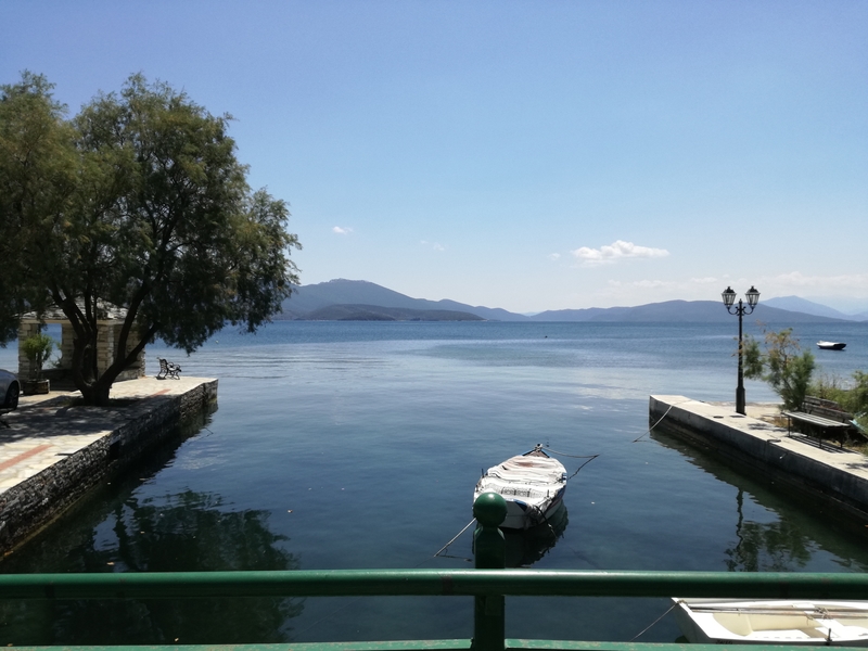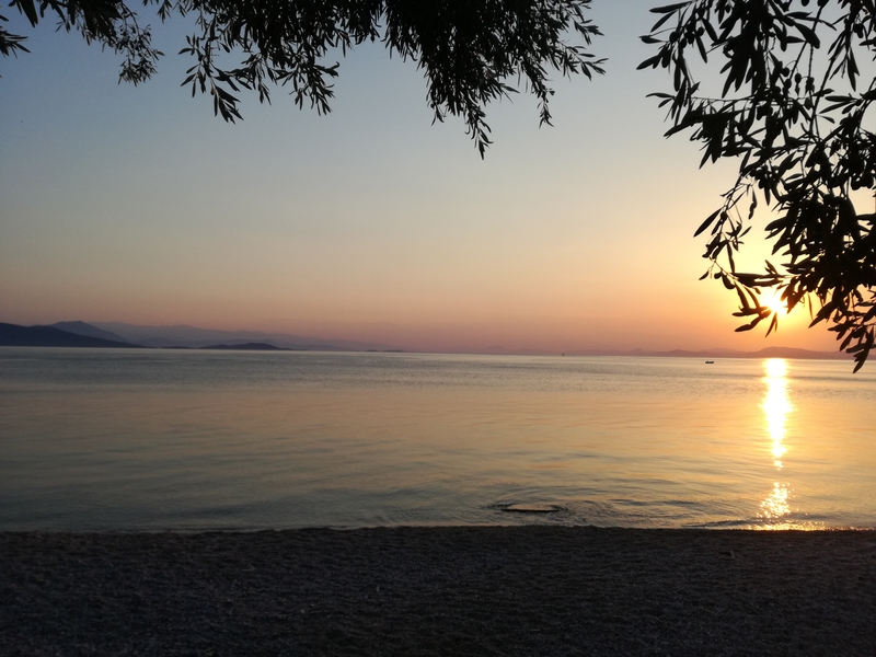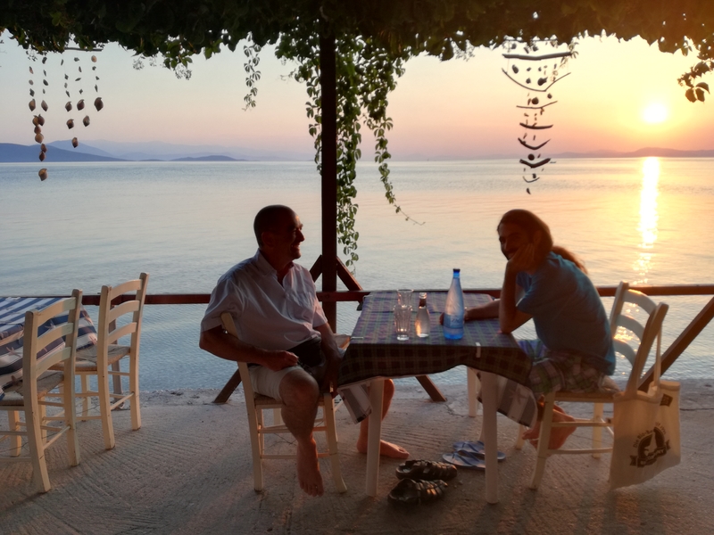Lundi, Armand est venu avec nous, il s’est installé au café le plus près de la mer, le plus vieux et le plus tranquille. Il en a profité pour lire un livre d’informatique – occupation un peu bizarre dans ce cadre! Vers 8 heures, nous nous sommes tous retrouvés au restaurant Periyali, avec la vue sur le golfe et le soleil couchant.