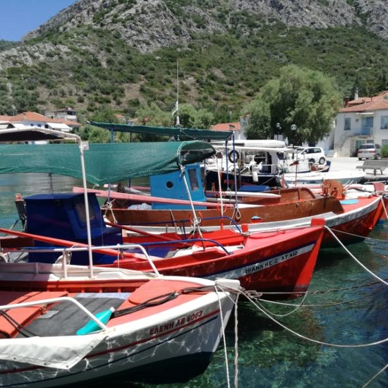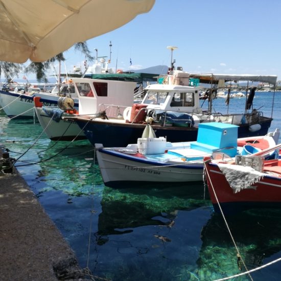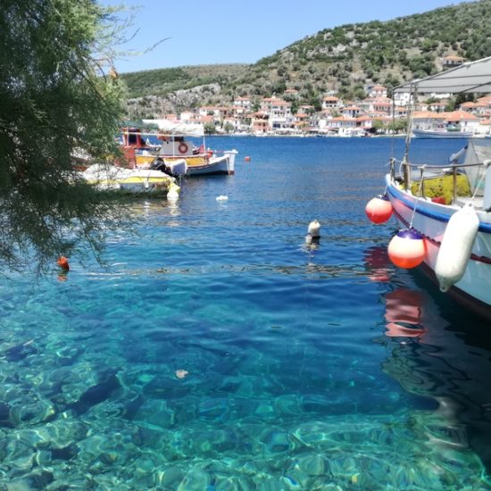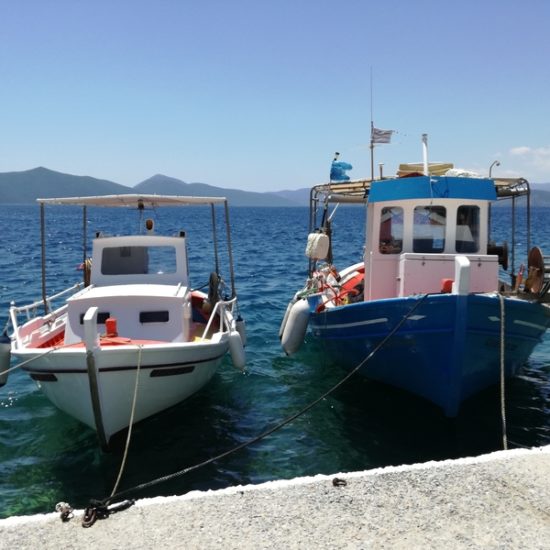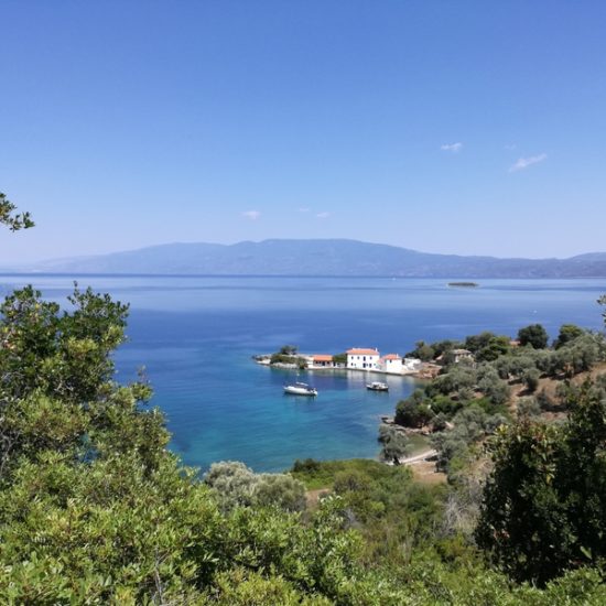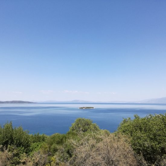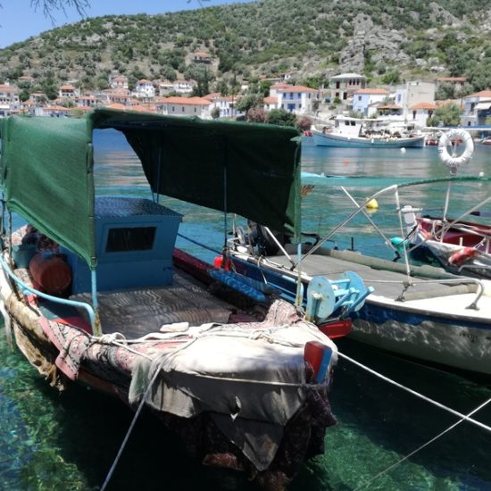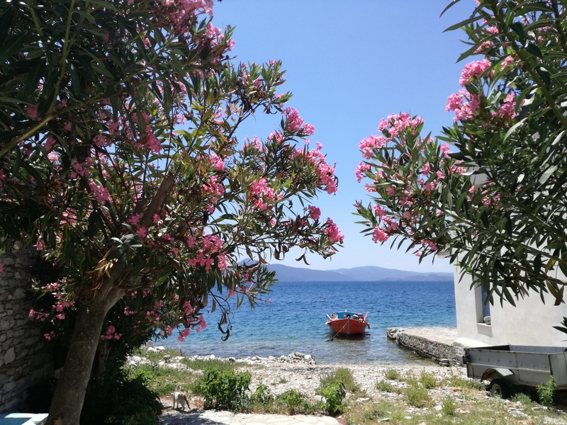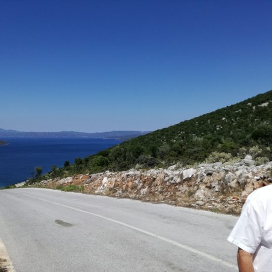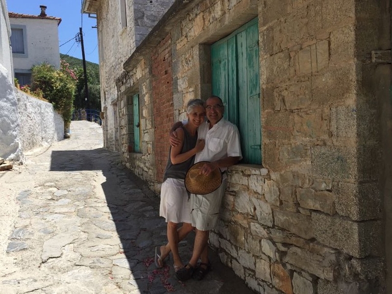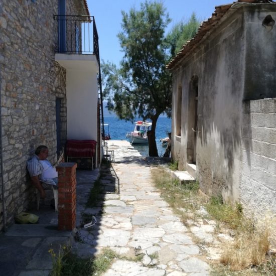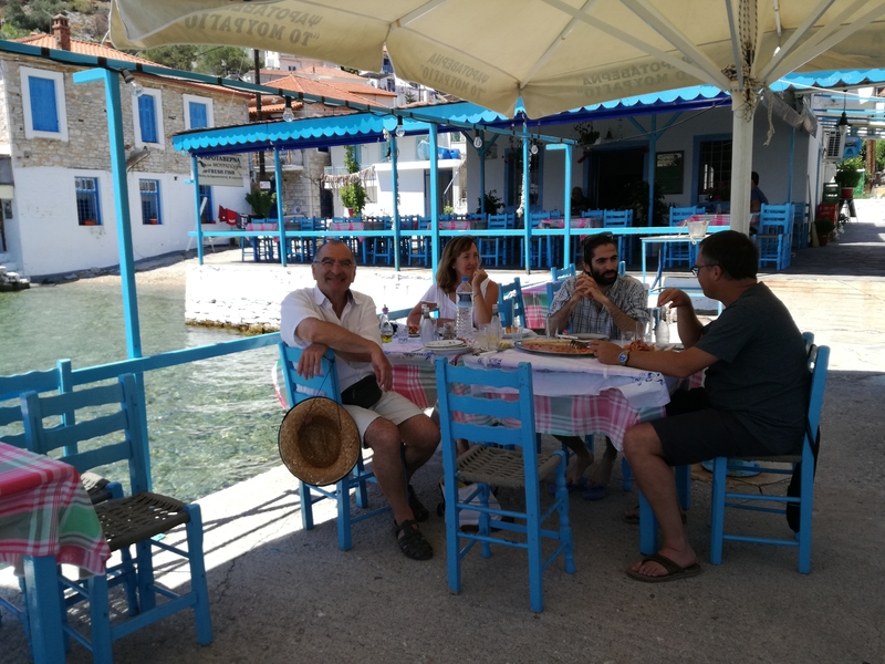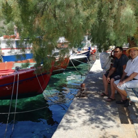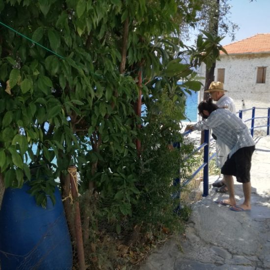Nous avons emmené Sassoun et nos amis Geneviève et Marc à Agia Kyriaki, nous voulions leur faire découvrir le bout du monde. Mais cette fois, le village est un peu moins endormi qu’à l’ordinaire : c’est jour de fête, des stands sont installés dans les ruelles et proposent des pâtisseries odorantes, et les deux sœurs sont invisibles. Le calme désuet du village est remplacé quelques instants par une effervescence discrète, vite oubliée, et le vent qui souffle fort nous fait tourner la tête.