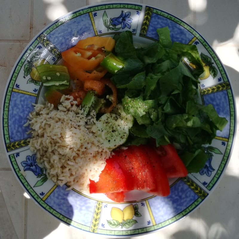 À midi, repas sous les oliviers. Riz pour moi, viande pour Armand. Les cigales chantent à tue-tête, l’air est chaud, nous sommes heureux.