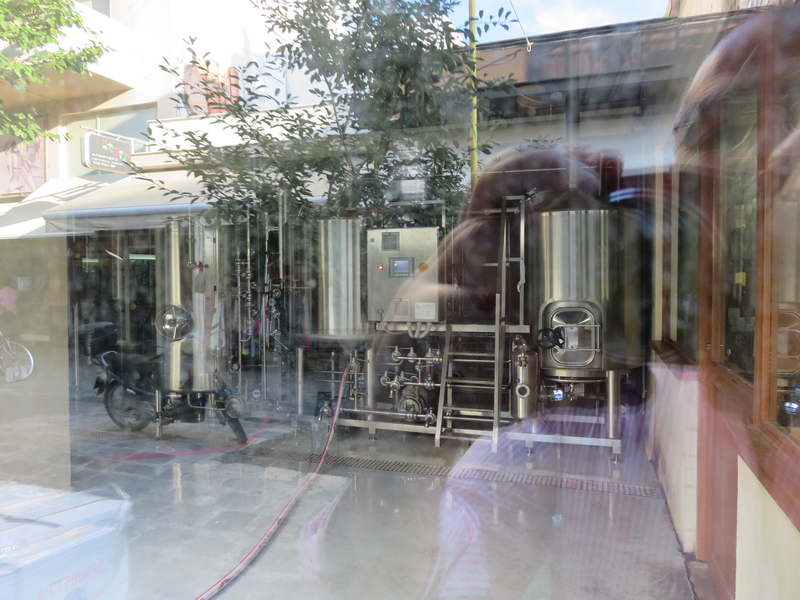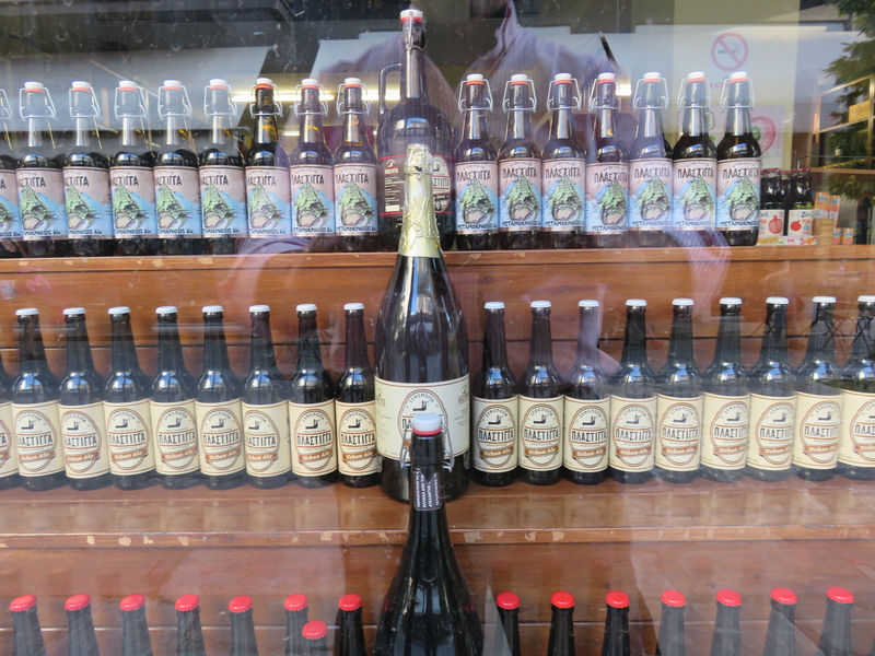 Ensuite je vais chercher quelques bières brassées sur place, dans la rue piétonne, rue Ermou, bières nommées Plastigga et absolument délicieuses, dont 3 grosses bouteilles pour Irini et Perikles. Le brasseur me demande d’où je viens, je dit Suisse et France, et il me dit avec des yeux brillants: la France, c’est le plus beau pays du monde. Le pays de la culture. L’Europe tout entière ne vaut pas la France… Je ne sais pas à quelle culture il pensait: la nourriture? La peinture, la littérature? La danse, la musique? Les champs vallonnés et les ciels étoilés du Quercy? Paris et ses théâtres? Qui sait… Il a monté sa brasserie en plein Volos, énormes cuves en inox, quelques bières: une blanche, une blonde, une Urban Ale, une Strong Ale, une Dry Stout, et une Metamorphosis, bière légèrement ambrée à l’écorce d’orange, comme me l’explique l’amoureux de la France.