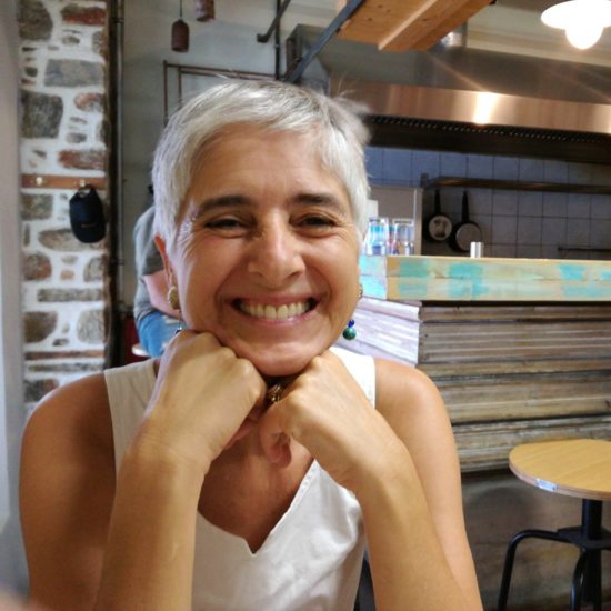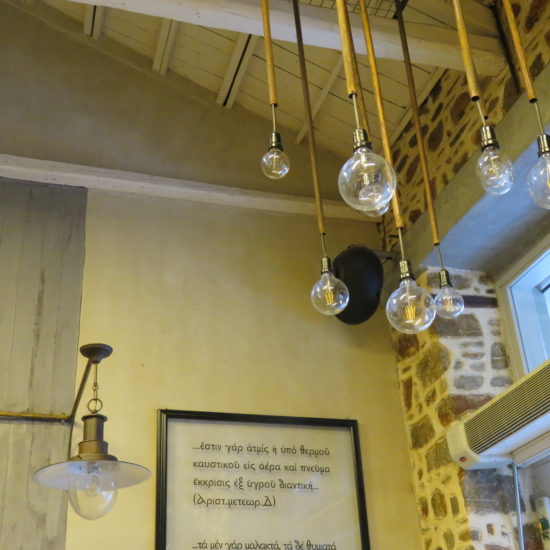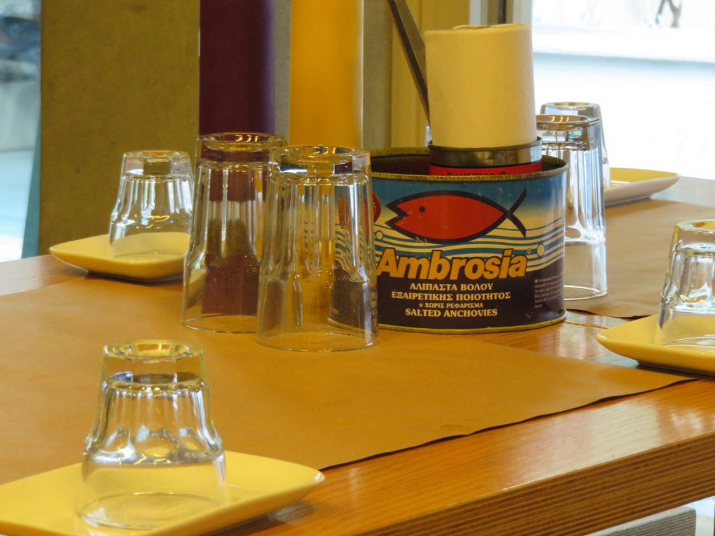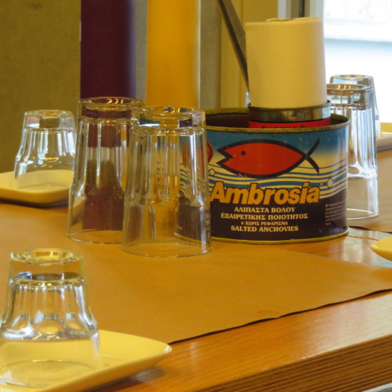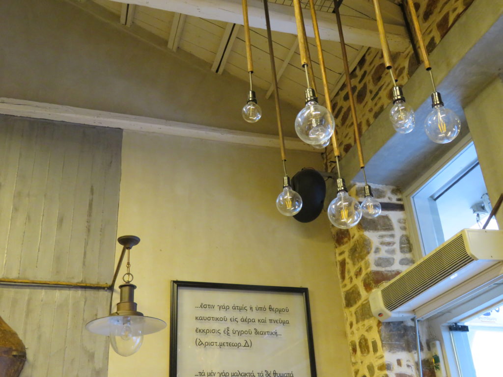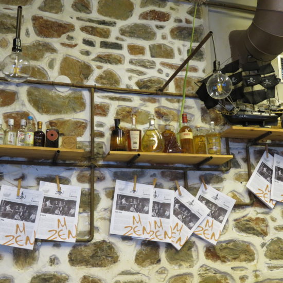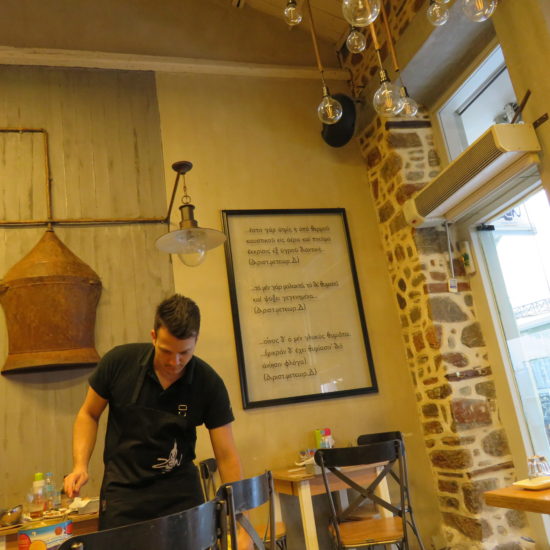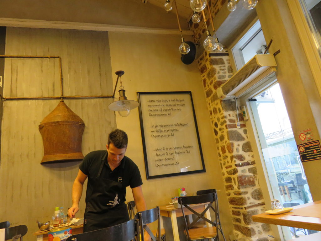 Je retrouve Armand dans un MeZen qui doit être encore plus connu que l’année passée, bondé, niveau sonore élevé, fumée, mais service toujours aussi parfait, garçons énergiques et attentionnés. Comme dans tous les autres tsiporadiko, la première chose qu’on nous sert, dès que nous nous asseyons, c’est le tsipouro. Ici le garçon nous salue d’abord, puis ne dit pas simplement avec ou sans? Il demande: glykaniso? C’est oui. Et puis on peut commander un mézé à son goût, ou se laisser surprendre. Le décor est original. Il y a un grand tableau noir avec des citations de poètes grecs, et un cadre avec des citations en grec ancien – je ne comprends rien, mais c’est beau à voir. L’ambiance est légère, animée, amicale – mais ici aussi, difficile de se parler! La prochaine fois, pour pouvoir discuter sans crier, on retournera à nos anciennes amours – au Kyklos, sous les arbres, tsiporadiko calme et ombragé, peu fréquenté à midi, où nous attend le sourire de la patronne et de sa fille à la si belle voix.
