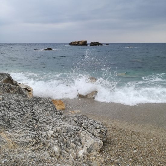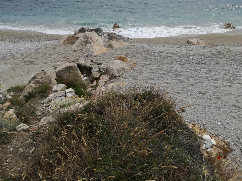 Il fait frais à nouveau, ciel couvert, mais vers 10 heures une éclaircie, je décide de descendre à Mourtitsa. Le chemin est beau même dans le gris du ciel et de la mer.