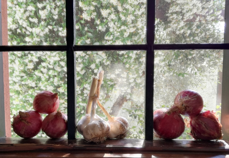 Sur le bord de la fenêtre de la cuisine, Armand a installé les oignons et l’ail achetés hier. Un tableau vivant.