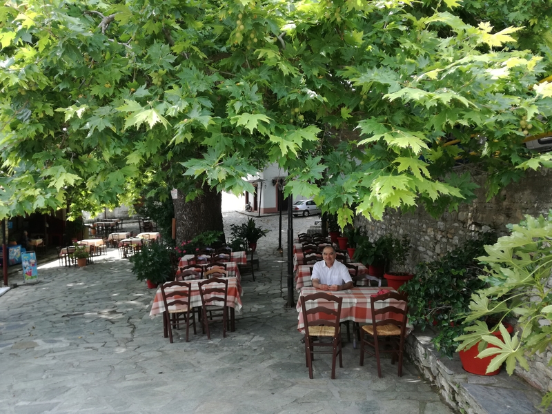 A midi, après quelques courses au marché, nous avons mangé chez Leonidas, sur la place du village à Xinovrisi. Quel bon sourire quand nous arrivons! Sa femme et sa mère nous accueillent elles aussi avec de grands sourires, huit mois depuis la dernière fois – deux jours on dirait, et pourtant, tout un hiver, de la neige, des inquiétudes, des joies, toute une vie depuis la dernière fois. Boulettes de courgettes – kouloukithokroketes, dolmas délicats faits par la mère de Leonidas et frites pour moi, côtelettes d’agneau au grill et légumes – vlita – pour Armand. C’est la grand-mère qui s’occupe du grill. Nous passons un moment à bavarder dans la taverne, il y a des photos des temps anciens au mur, le père, le grand-père, le frère, et la place avec les platanes encore jeunes, au tronc fin.