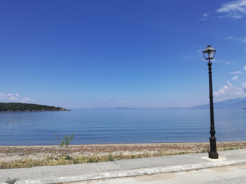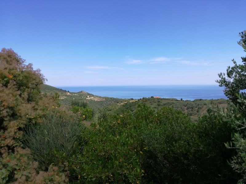 Je repars deux heures plus tard, épuisée de concentration, je ne sais pas si c’est la poterie ou essayer de comprendre le grec et tenter de m’exprimer qui est le plus épuisant. En sortant du jardin, j’arrive sur le chemin qui mène droit à la mer. Je rentre lentement, je remonte à Argalasti, à Xinovrisi, puis je prends la route à droite en sortant du village, celle qui donne sur la mer, au-dessus de Melani, pour arriver à Potistika et remonter vers chez nous. Il fait beau.