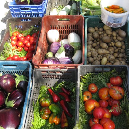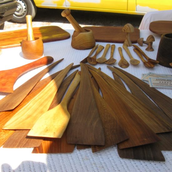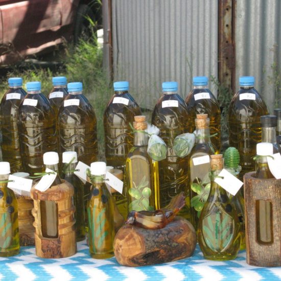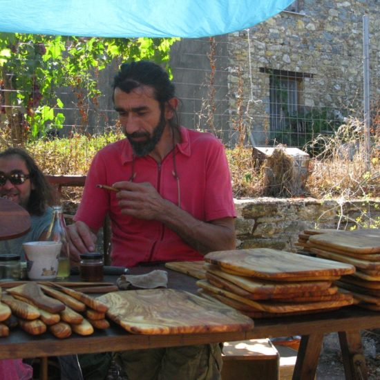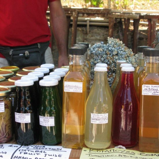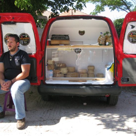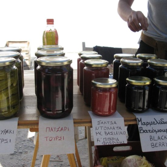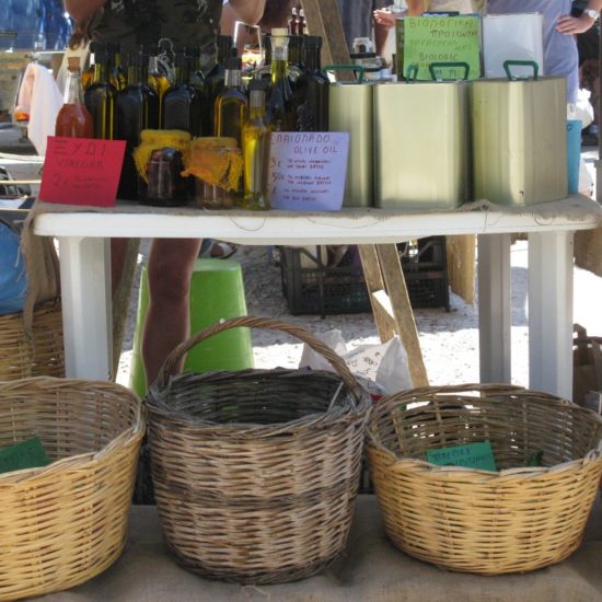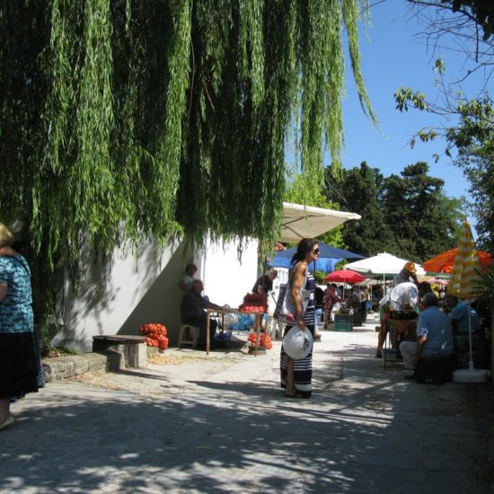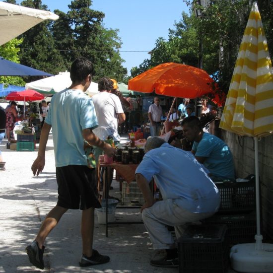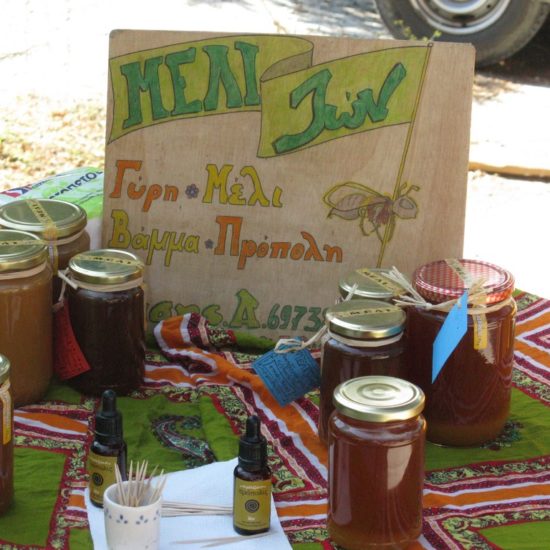 Hier, Vicky et moi sommes allées au marché d’Argalasti. Il a changé, et en mieux. Avant, les quelques denrées vraiment produites sur place étaient vendues devant l’ancien lavoir, à l’entrée du marché, tout le monde entassé sur une trop petite surface, et le marché classique – fruits et légumes industriels, ustensiles de cuisine, chaussures, habits, nappes et draps made in China – s’étendait sur une seule ruelle. Maintenant, le marché est en forme de T, avec toujours le marché classique sur une longue barre horizontale du T, et sur la verticale, plus courte, des étals de fruits et légumes de la région, vendus par les maraîchers eux-même, et même quelques personnes qui vendent les légumes de leur jardin, non-traités, savoureux; il y a aussi un vrai marchand de fromages, dont certains de Crète – les plus prisés – qui expose sa marchandise avec art dans le fond de sa camionnette, et attend les acheteurs, tranquillement assis sur son tabouret de bois; de l’huile, des pistaches, et à droite, blottie entre les deux barres du T, une petite place ronde, sur laquelle quelques artisans vendent savons, planches de bois d’olivier, huiles et eaux parfumées, bijoux et autres colifichets.