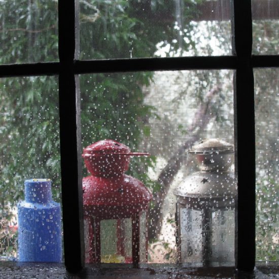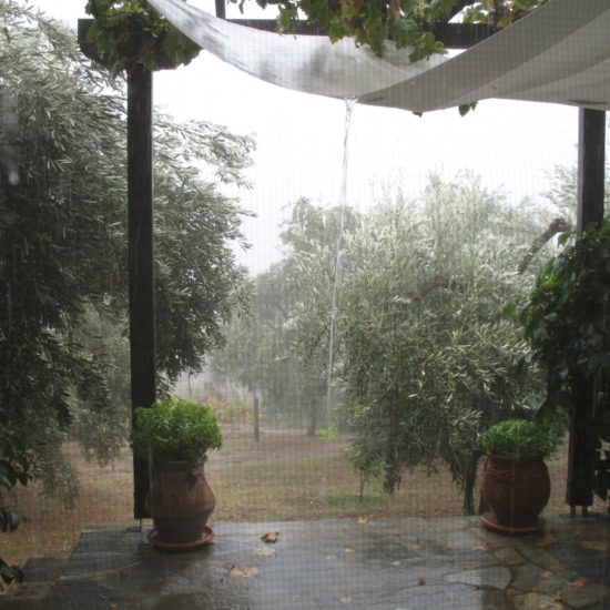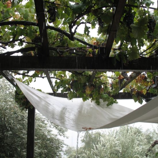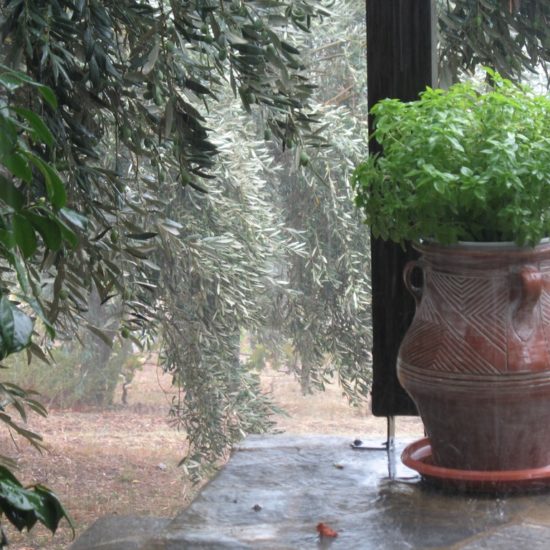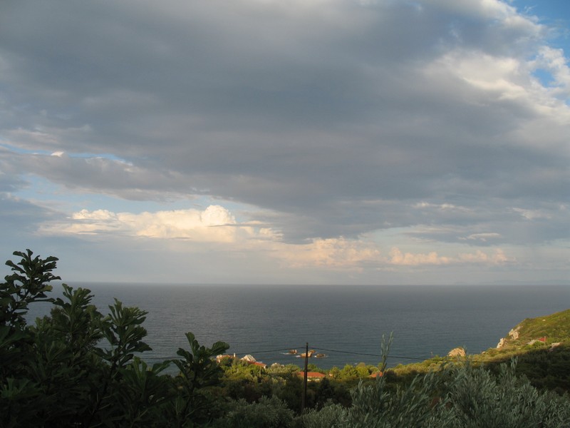 Mais quand il pleut, plus de bleu, seulement une palette de gris. Gris le ciel, et les nuages, et la mer. Cet après-midi, nous avons été réveillés en sursaut pendant la sieste par un violent coup de tonnerre, une pluie si forte qu’elle pénétrait par la porte ouverte. Bien au chaud dans notre studio, la pluie est magnifique, une bonne odeur se dégage de la terre humide. Mais à l’époque où nous campions, si une grosse pluie dans l’après-midi était bienvenue après de fortes chaleurs, c’était autre chose quand cela durait, et surtout pendant la nuit: difficile de dormir avec le vent qui agite le toit de la tente, qui tente d’arracher les ficelles qui la retiennent. Sans parler de la fois où nous nous sommes réveillés dans ce qui nous a tout d’abord semblé un matin tiède et agréable, jusqu’à ce que nous fassions un premier mouvement qui nous révèle le véritable état dans lequel nous étions: dans une grande flaque d’eau, dans la tente, matelas et draps trempés.