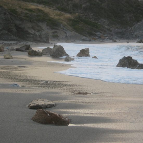 30 août, le temps a commencé à changer. Nuages gris, mer agitée, un peu de fraîcheur après les belles journées immobiles sous la chaleur. Nous sommes descendus sur la plage pour humer l’air, sentir les embruns sur la peau, marcher dans l’écume et les vagues. Moi qui adore la douceur de la plage les jours de bonasse, je l’aime aussi plus sombre, vivifiante, transformée par les vagues qui se fracassent contre les rochers, déserte, sauvage.