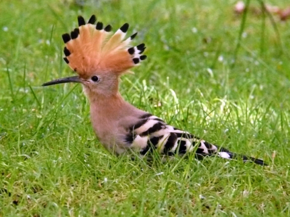Ce matin, avant que le vent ne se lève et alors que je rêvassais dans le hamac, j’ai entendu un très léger bruit. Sans bouger, j’ai tourné mes yeux en direction de ce froissement, et j’ai vu, à deux mètres à peine de moi, pour la première fois de ma vie… une huppe ! Elle avançait en hochant de la tête, sa huppe déployée, dans l’herbe…