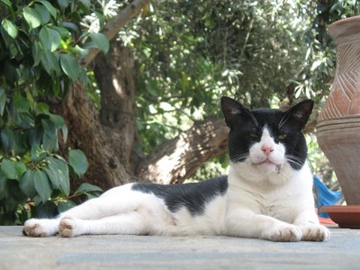 Au menu hier : lecture, bavardages, repas de tomates, feta et pain – nous avons oublié d’acheter des olives – assorti d’une bière Fix, sieste et plage. Tard, car nous avons dormi près de deux heures ! Armand est parti à la pêche, j’ai bavardé avec nos amis et suis restée dans l’eau jusqu’à ce qu’il fasse presque nuit, et qu’Armand revienne avec une future soupe à sa ceinture. J’ai profité de la mer calme pour aller voir les poissons, qui remarquent bien que je n’ai pas d’intentions belliqueuses : énormes Sars de pleine eau, et grands bancs de très jolis Saupes, gris clair à la nageoire caudale jaune, qui brillent dans le soleil quand ils se retournent. Ils gardent une distance raisonnable, mais ils seraient à portée de harpon – ce qu’ils ne seraient pas si j’en avais un…