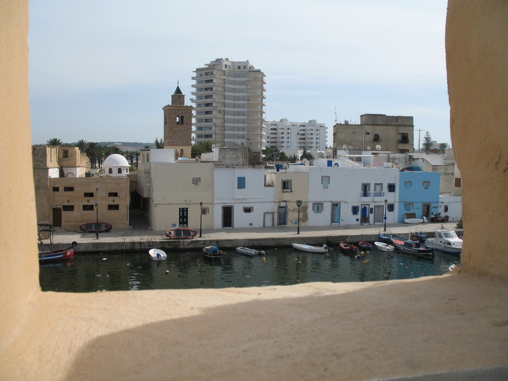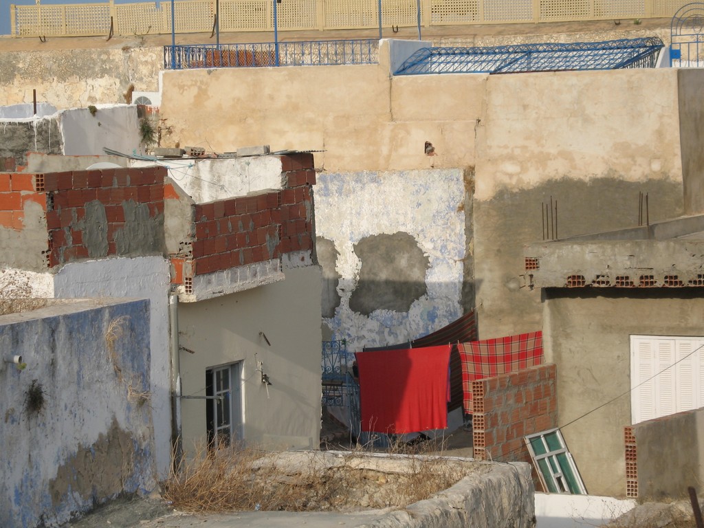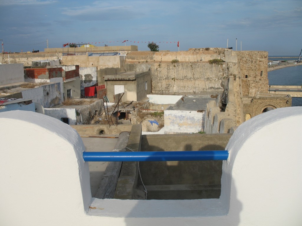 Finalement, un vieux monsieur qui parle français nous conduit jusqu’à une porte en bon état, mais qui reste sans réponse. Il frappe alors à côté, où une connaissance habite, qui pourra sûrement nous aider. En effet, la femme qui lui répond pense que sa voisine pourra certainement nous louer son appartement. Après quelques pourparlers téléphoniques, Monique nous loue son 4 pièces pour deux jours, avec une vue émouvante sur le vieux port depuis les fenêtres, percées à même le mur d’enceinte de la médina. De là, on entend tard la nuit et tôt le matin l’appel du muezzin de la mosquée d’en face – un vrai appel chanté, pas un CD qui répéterait toujours la même mélopée. Et plus lointains, les autres appels, des autres mosquées.