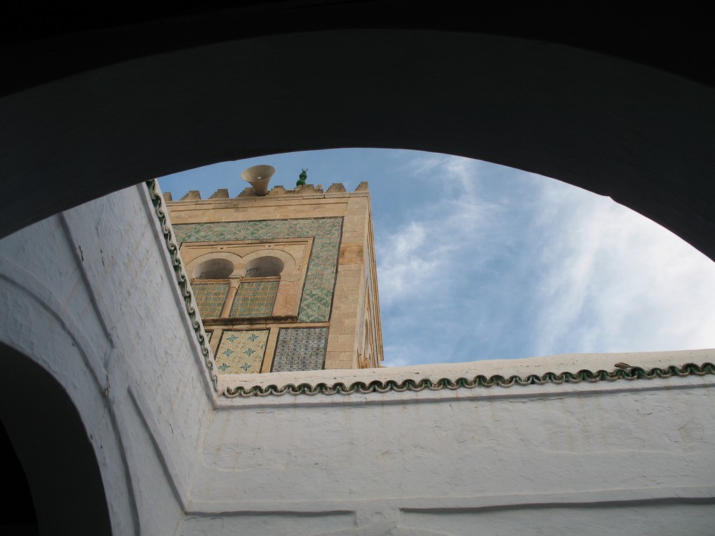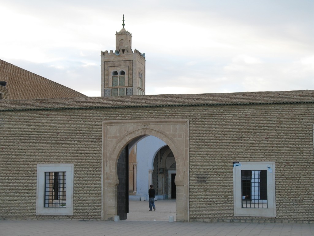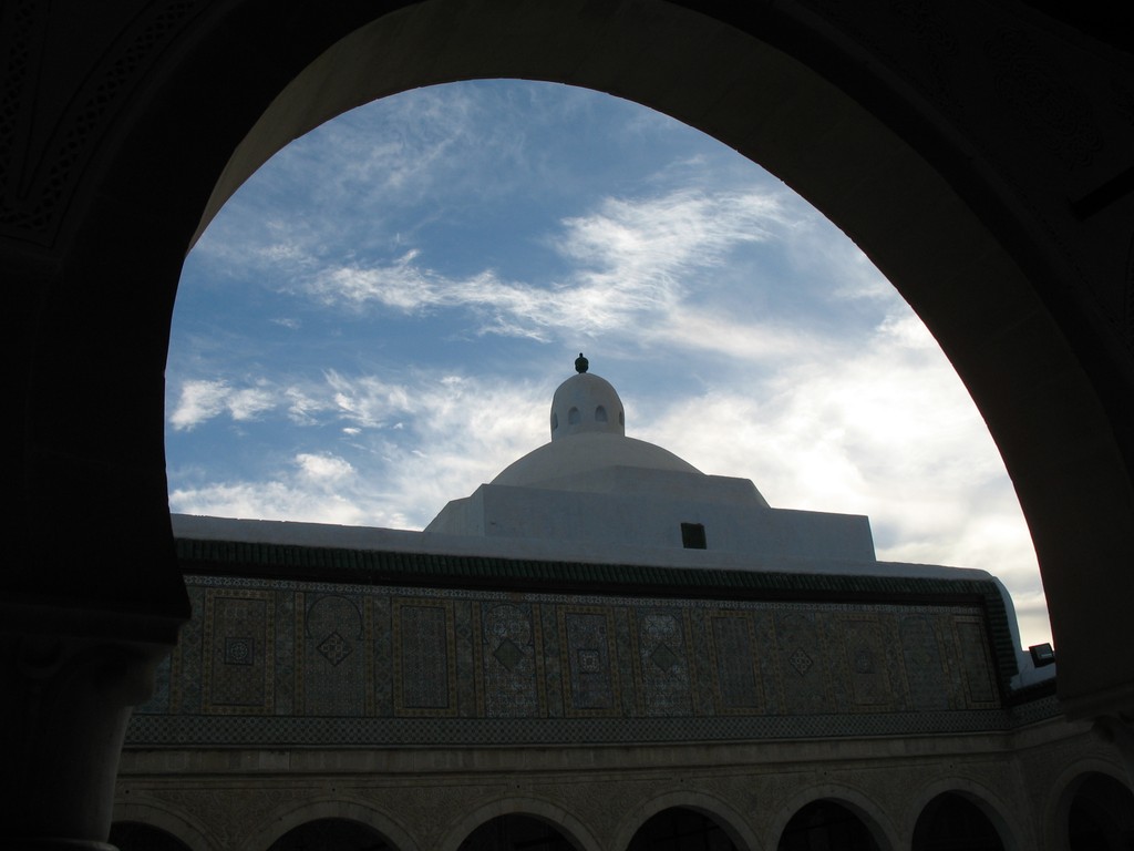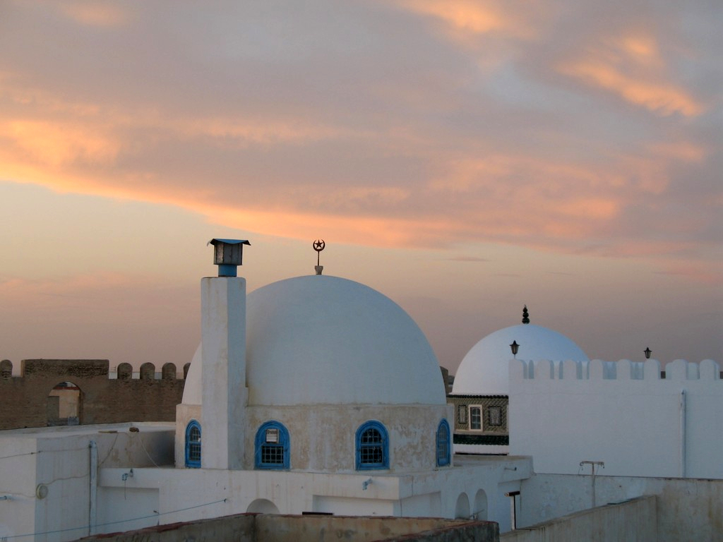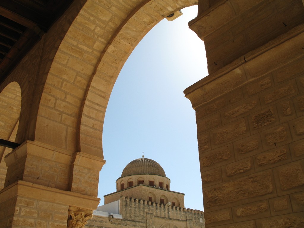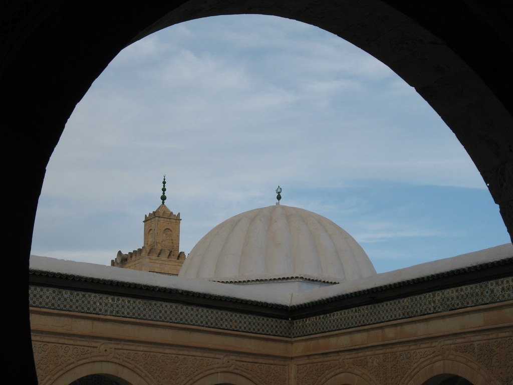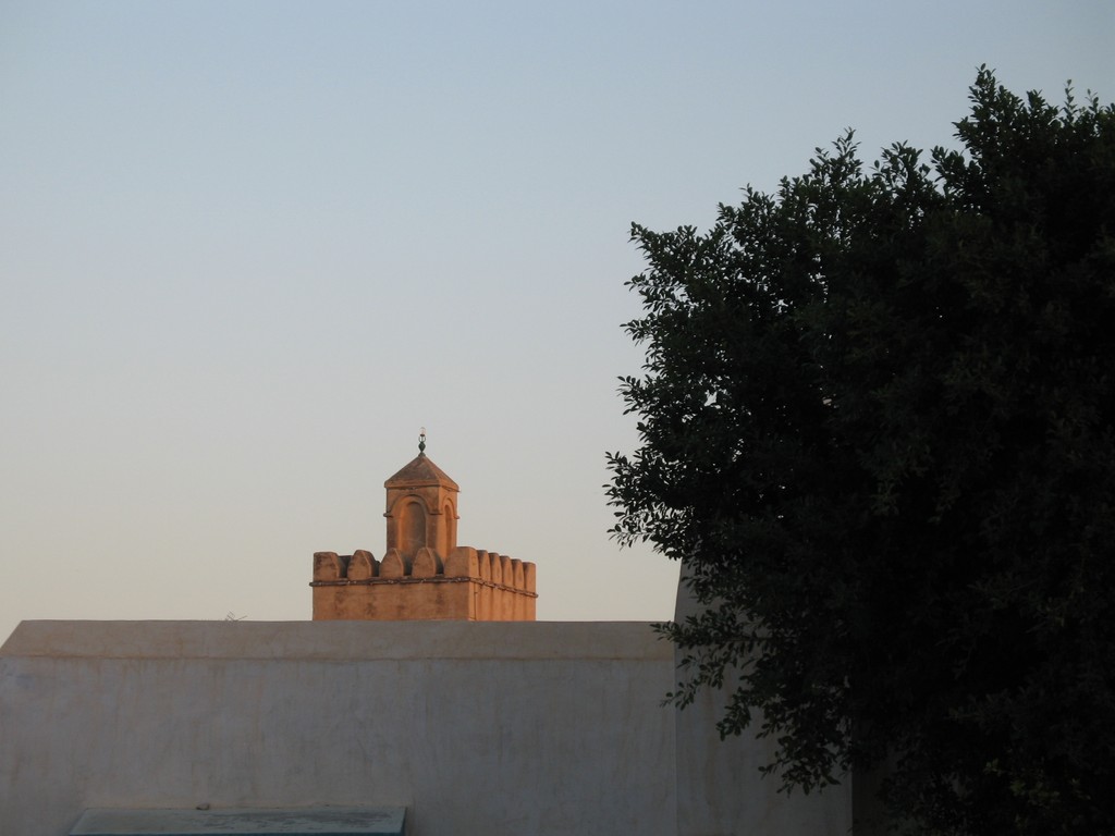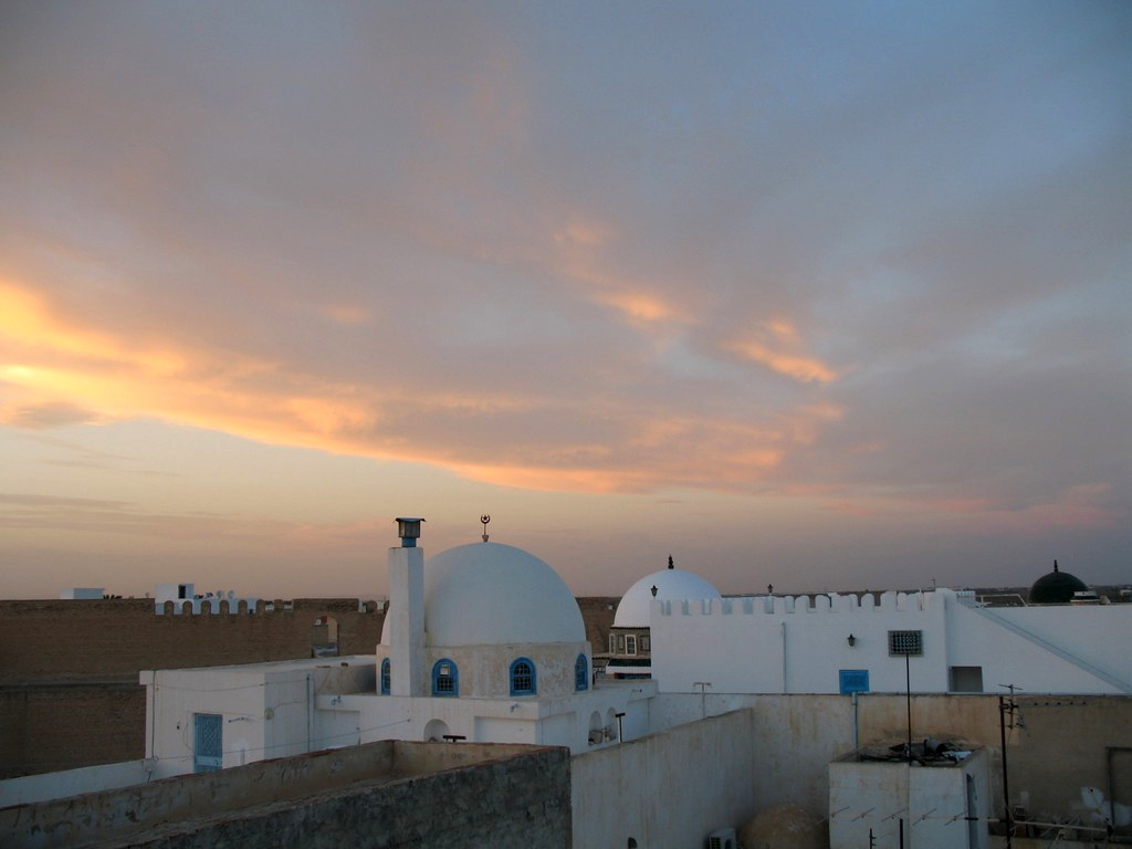 Dans le louage qui nous mène à Kairouan, nous faisons la connaissance d’Aïda, prof de français et dont la fille étudie à Genève. Elle nous propose de nous servir de guide. Après un saut à l’hôtel pour se rafraîchir, nous voilà prêtes à visiter un ancien mausolée, connu sous le nom de la Mosquée du Barbier, qui fait partie d’un ensemble religieux appelé zaouïa. Elle nous montre ensuite les bassins des Aghlabides, un incroyable et ingénieux système raffiné de bassins édifiés vers 860, alimentés par drainage et barrages par les eaux de pluies et les rivières environnantes. Plus tard, ils seront alimentés par un aqueduc amenant l’eau de source de Cherichira, à 40km de Kairouan. Peu à peu le ciel rosit, et nous avons la chance de pouvoir grimper sur les remparts pour faire connaissance, de l’extérieur et en surplomb, avec la Grande Mosquée.