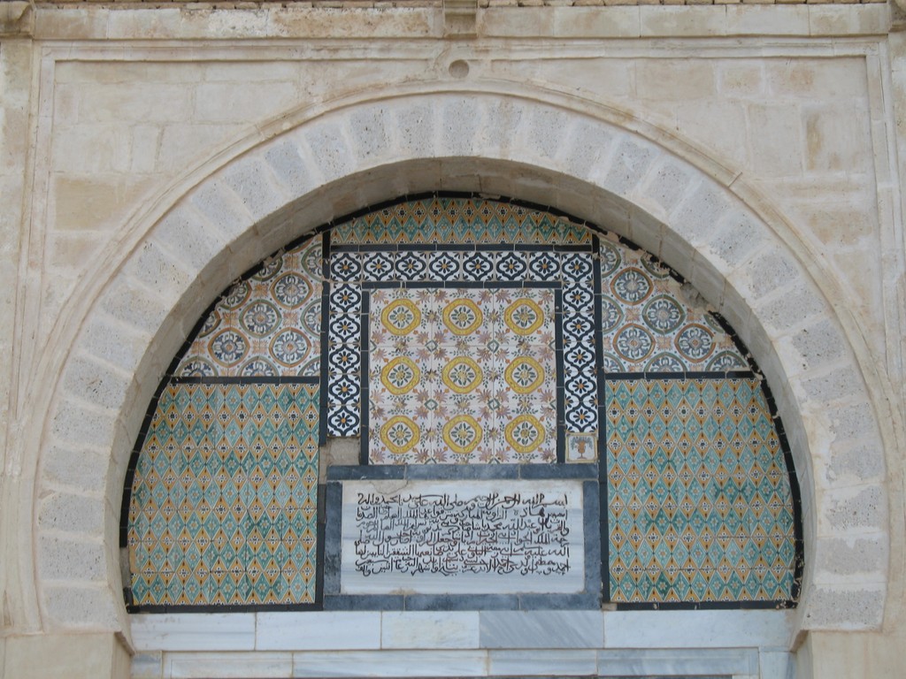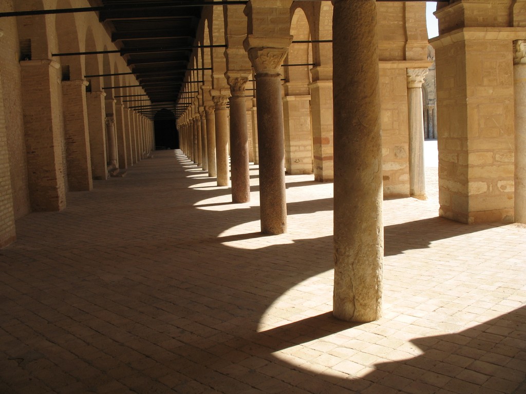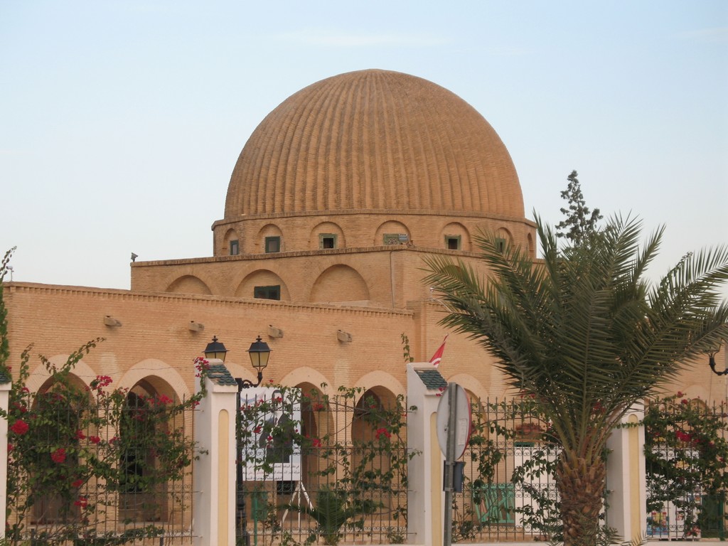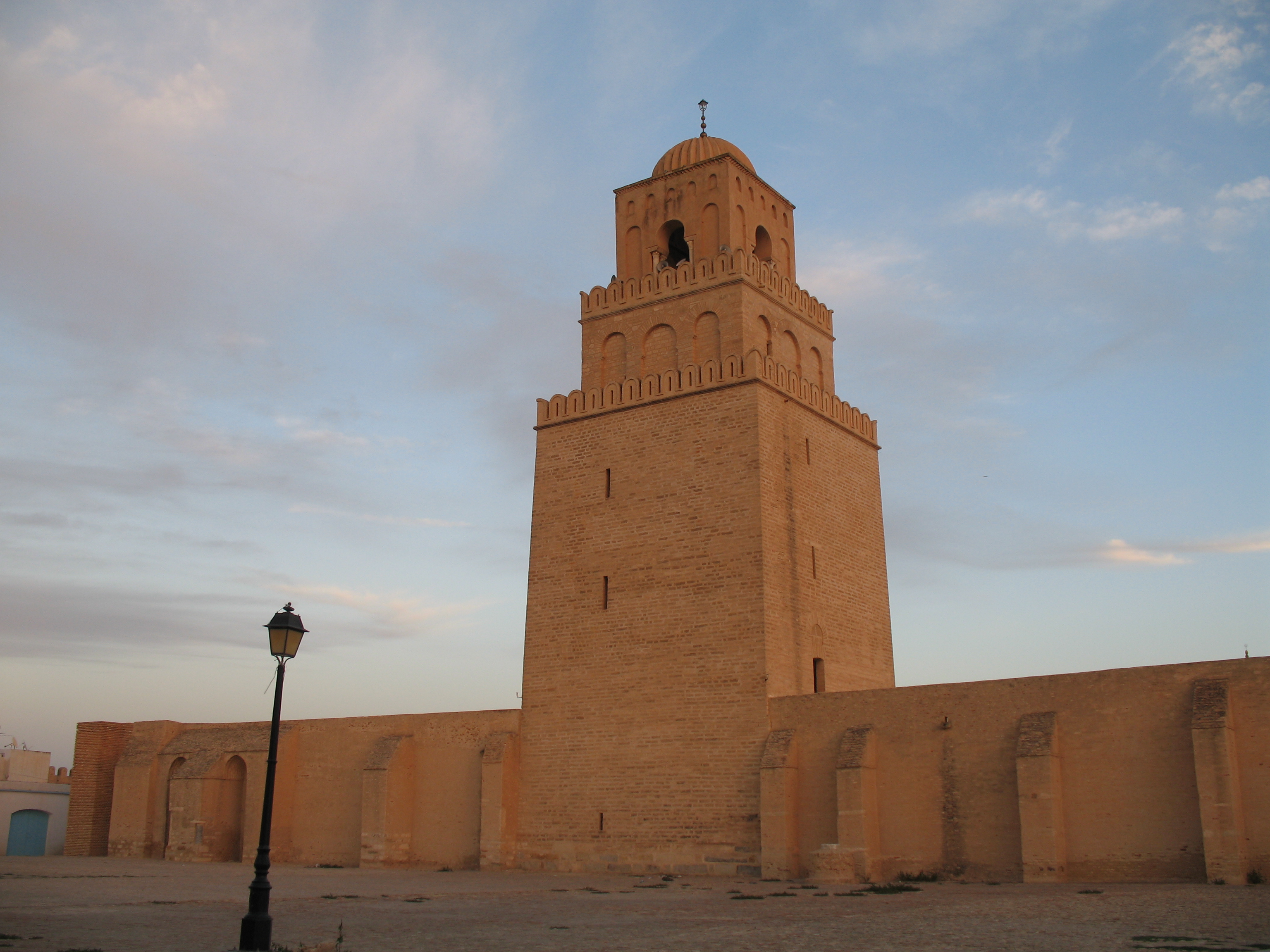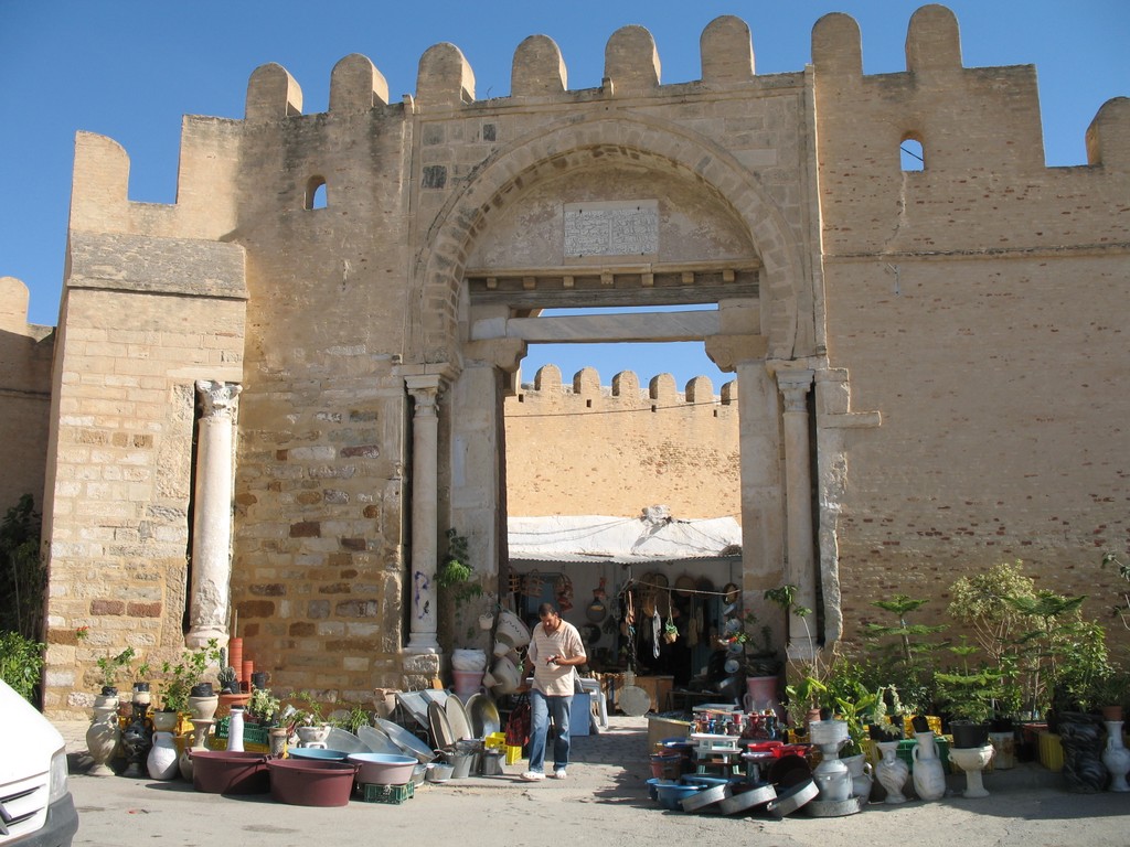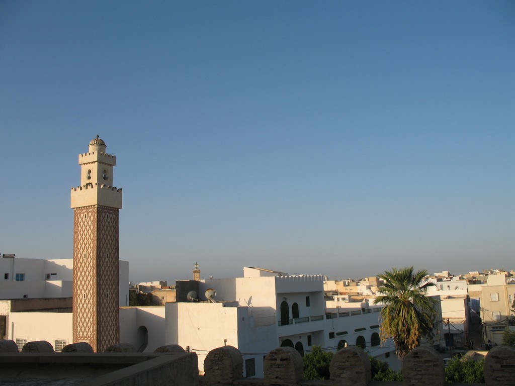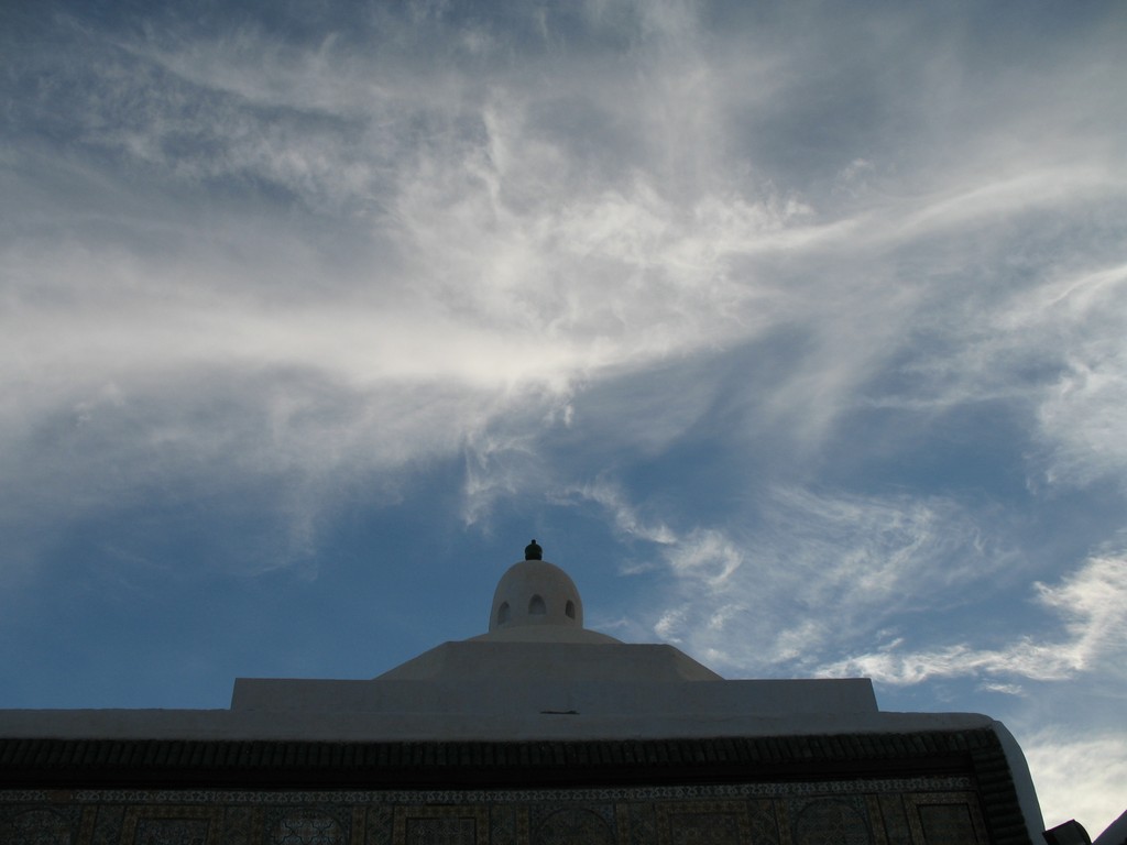 Dans le louage qui nous mène à Kairouan, nous faisons la connaissance d’Aïda, prof de français et dont la fille étudie à Genève. Elle nous propose de nous servir de guide. Après un saut à l’hôtel pour se rafraîchir, nous voilà prêtes à visiter un ancien mausolée, connu sous le nom de la Mosquée du Barbier, qui fait partie d’un ensemble religieux appelé zaouïa. Elle nous montre ensuite les bassins des Aghlabides, un incroyable et ingénieux système raffiné de bassins édifiés vers 860, alimentés par drainage et barrages par les eaux de pluies et les rivières environnantes. Plus tard, ils seront alimentés par un aqueduc amenant l’eau de source de Cherichira, à 40km de Kairouan. Peu à peu le ciel rosit, et nous avons la chance de pouvoir grimper sur les remparts pour faire connaissance, de l’extérieur et en surplomb, avec la Grande Mosquée.