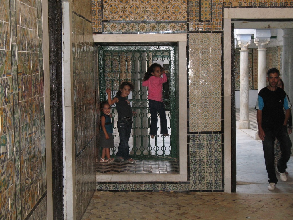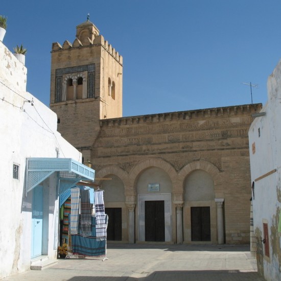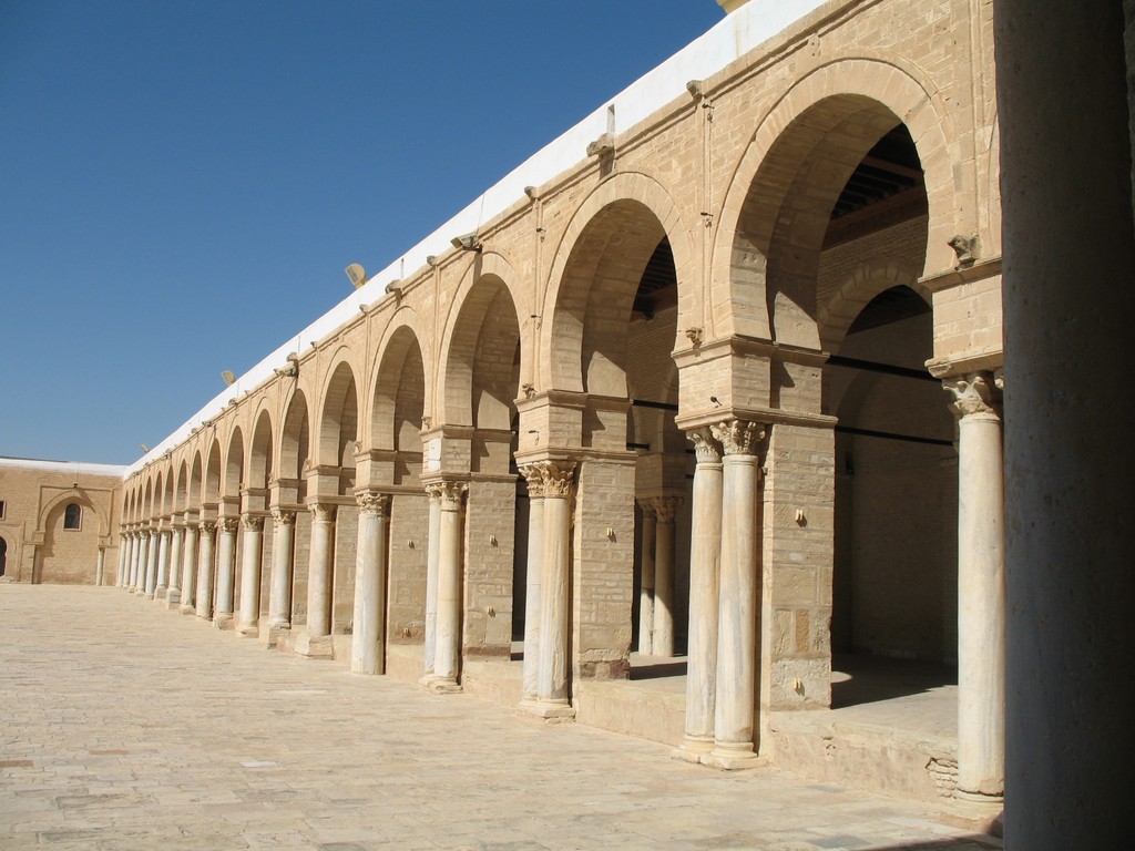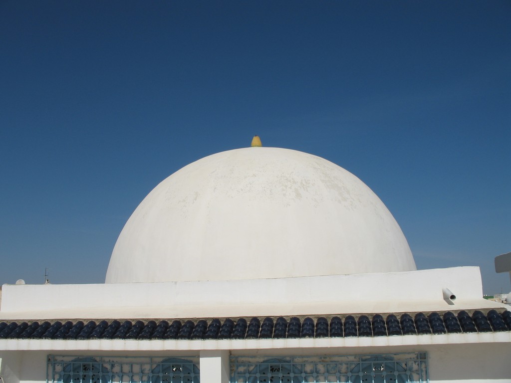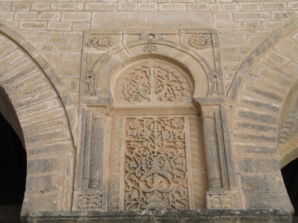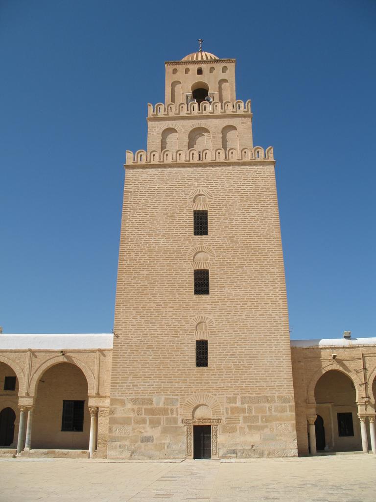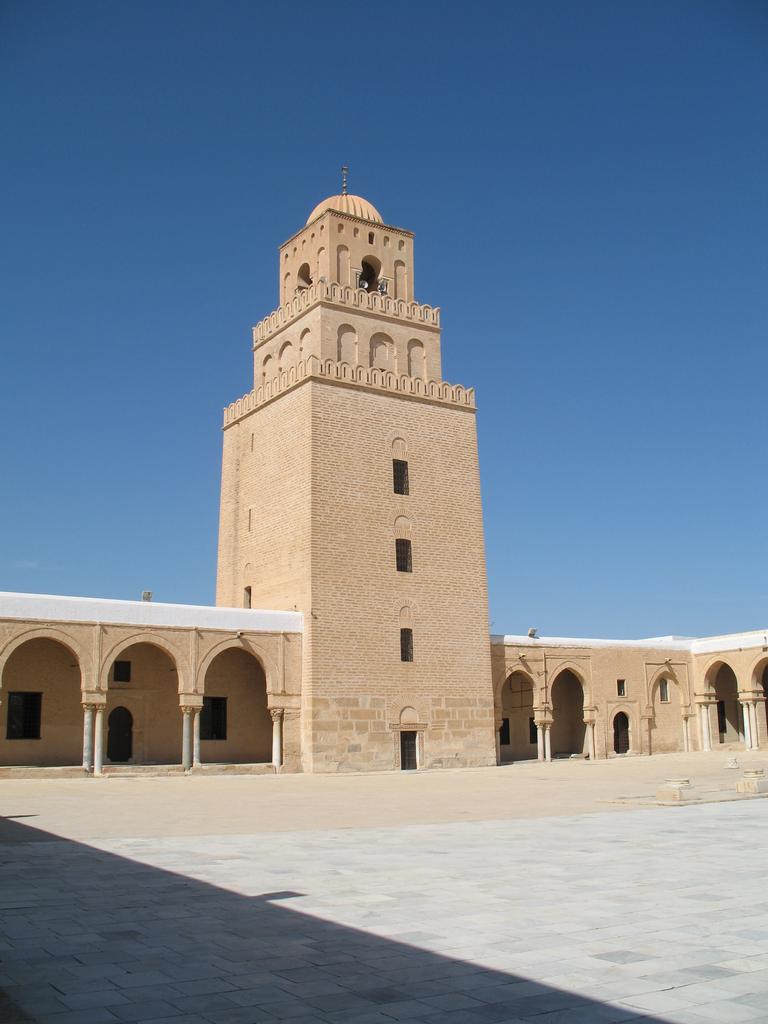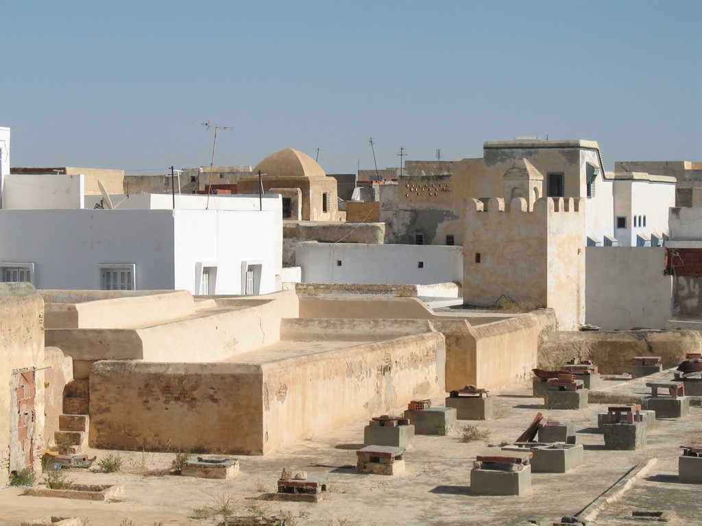 Dans le louage qui nous mène à Kairouan, nous faisons la connaissance d’Aïda, prof de français et dont la fille étudie à Genève. Elle nous propose de nous servir de guide. Après un saut à l’hôtel pour se rafraîchir, nous voilà prêtes à visiter un ancien mausolée, connu sous le nom de la Mosquée du Barbier, qui fait partie d’un ensemble religieux appelé zaouïa. Elle nous montre ensuite les bassins des Aghlabides, un incroyable et ingénieux système raffiné de bassins édifiés vers 860, alimentés par drainage et barrages par les eaux de pluies et les rivières environnantes. Plus tard, ils seront alimentés par un aqueduc amenant l’eau de source de Cherichira, à 40km de Kairouan. Peu à peu le ciel rosit, et nous avons la chance de pouvoir grimper sur les remparts pour faire connaissance, de l’extérieur et en surplomb, avec la Grande Mosquée.