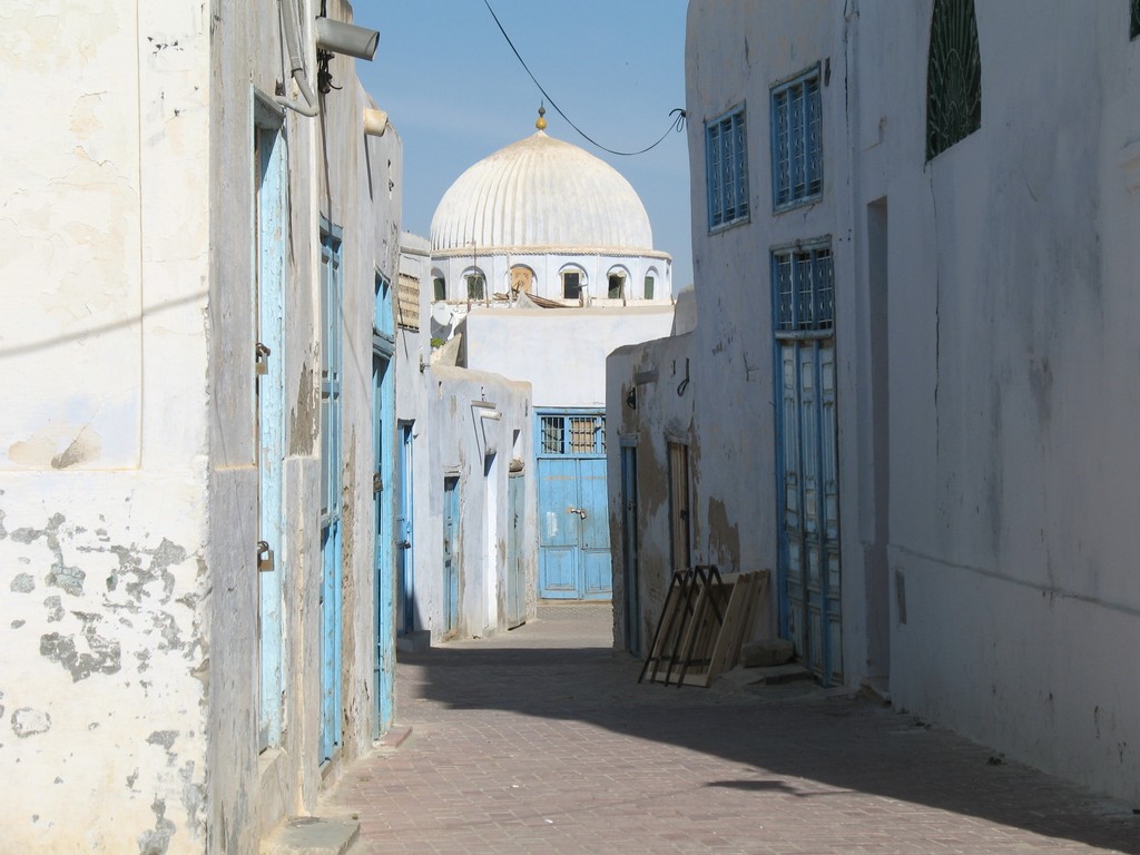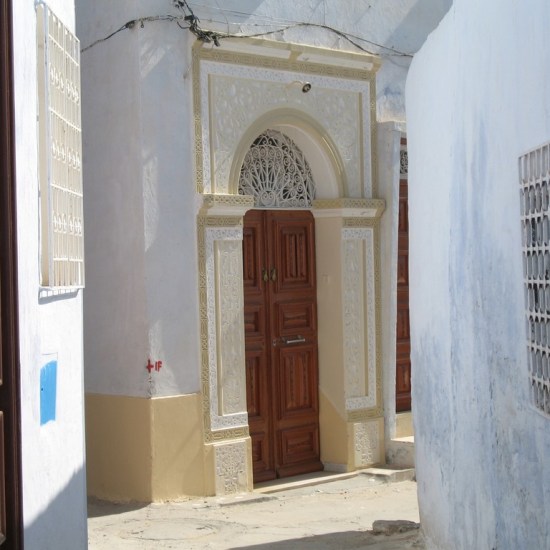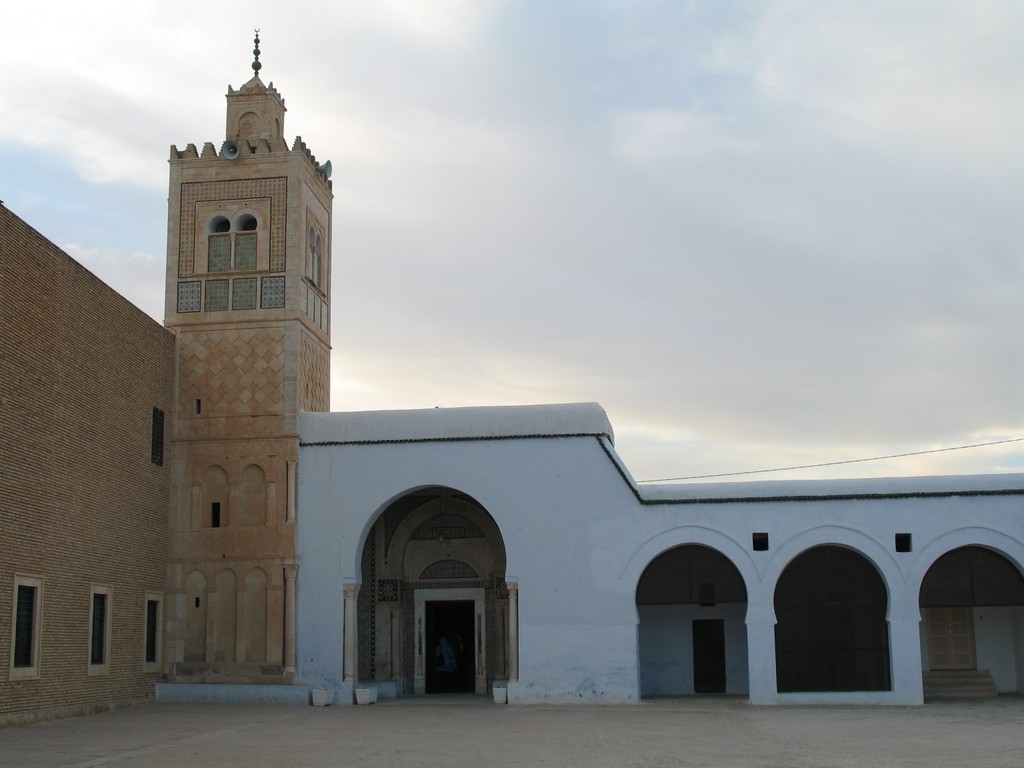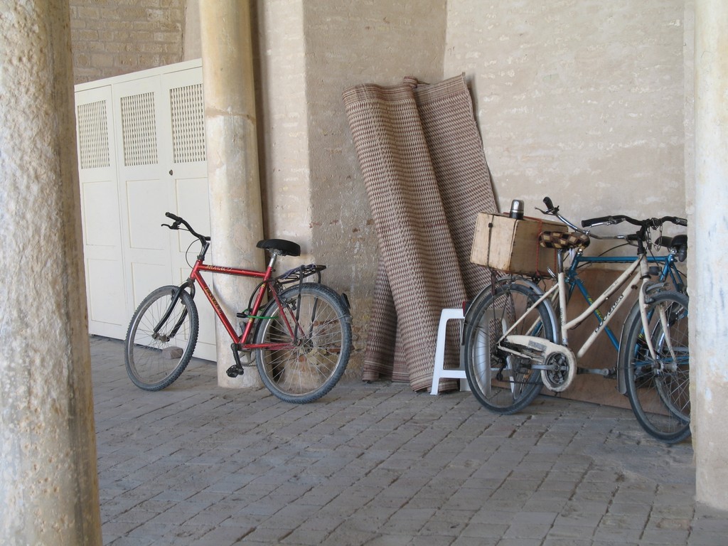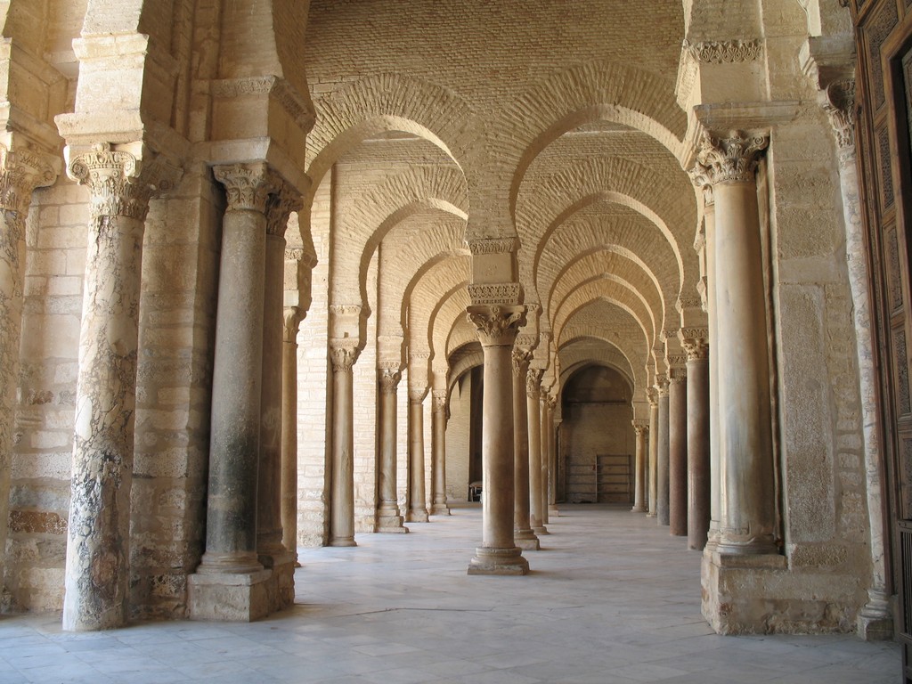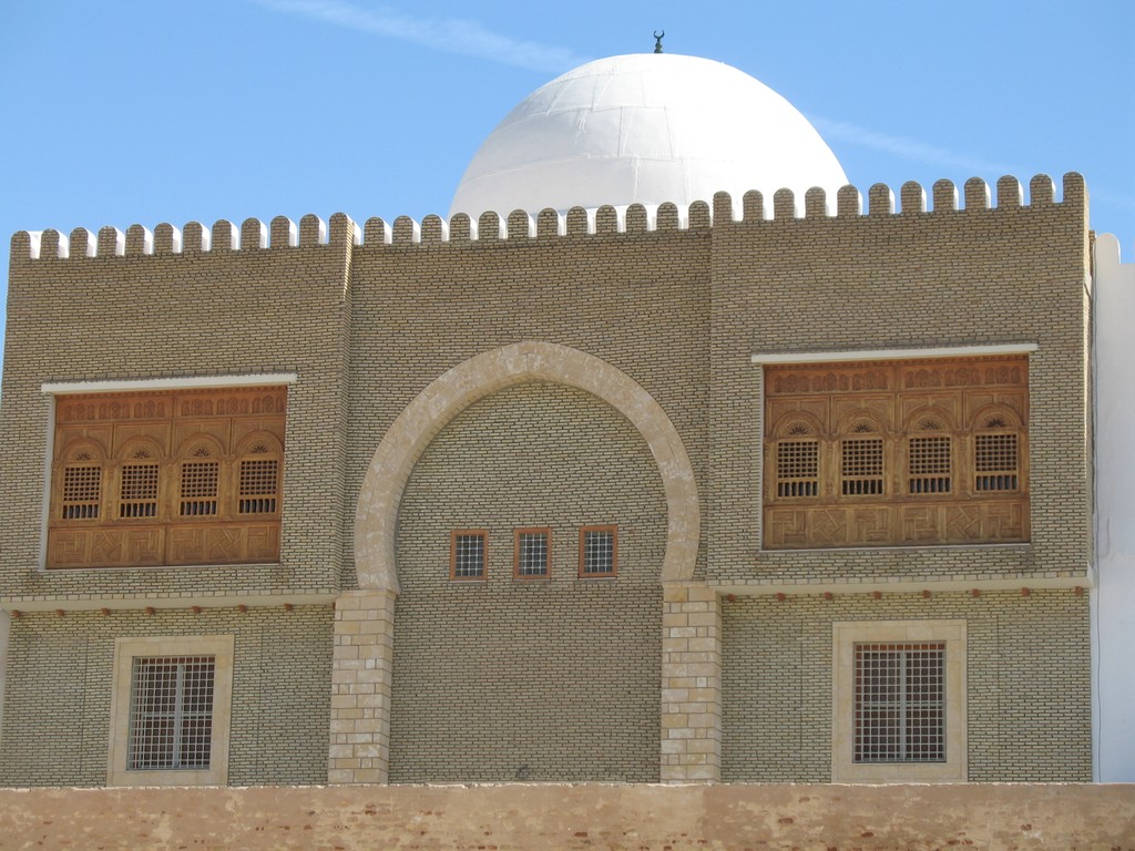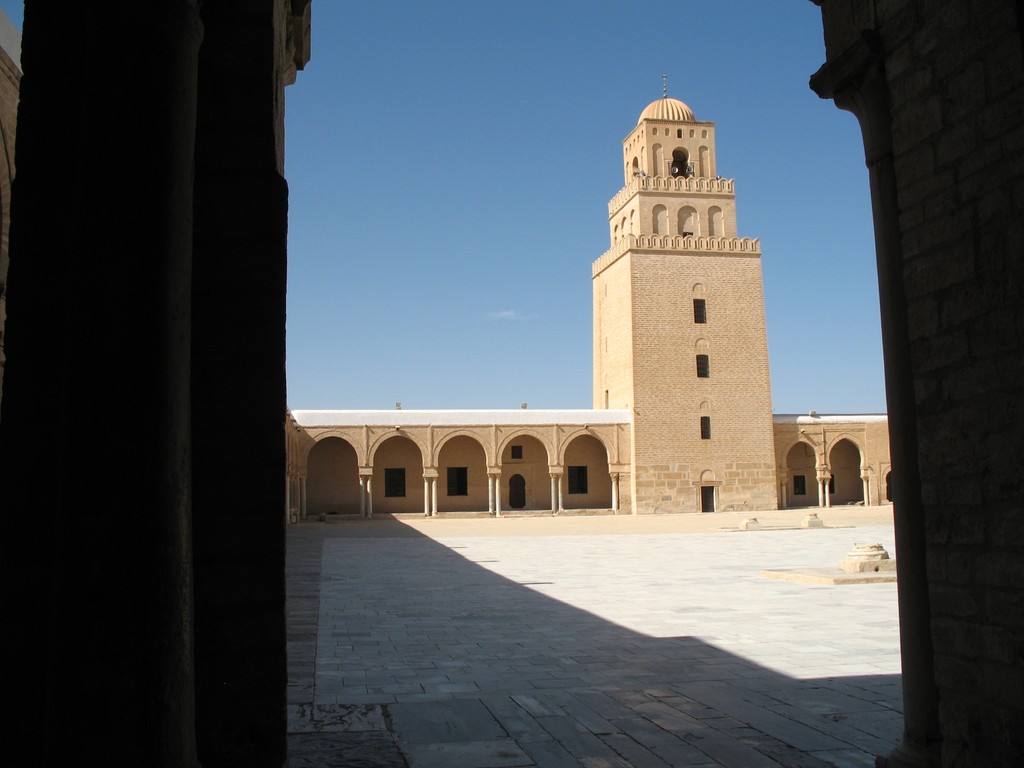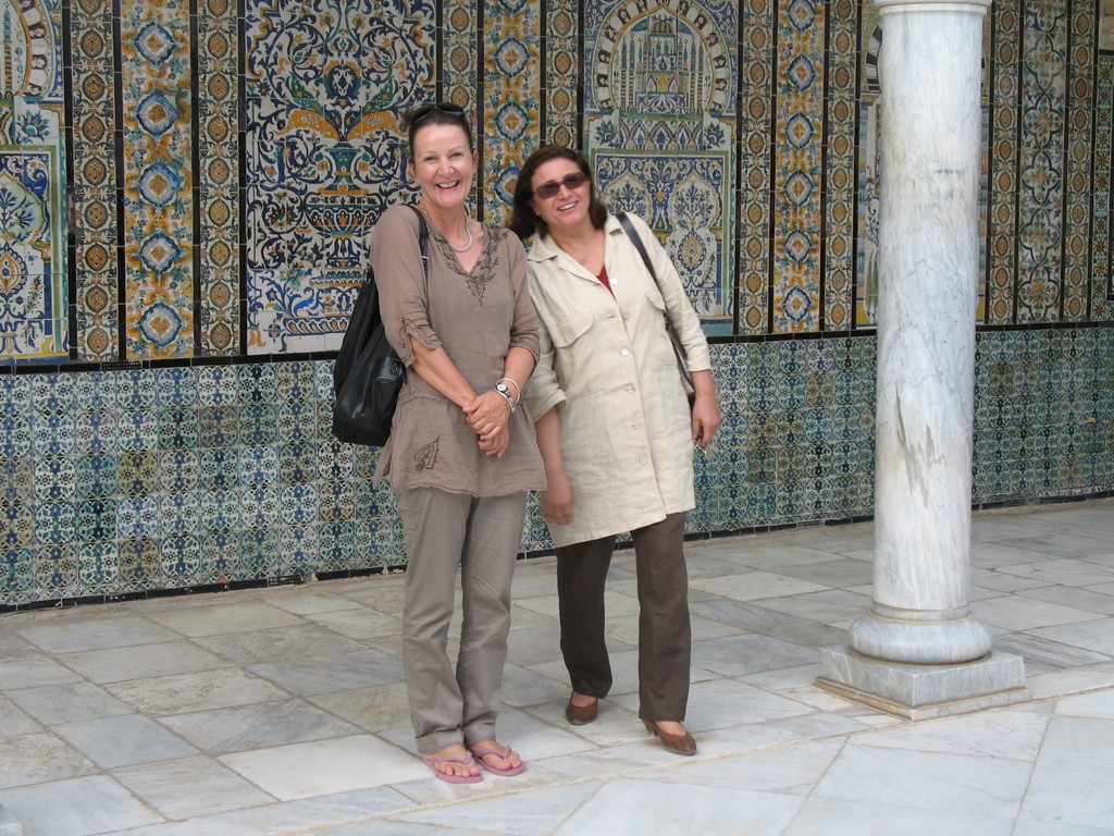 Dans le louage qui nous mène à Kairouan, nous faisons la connaissance d’Aïda, prof de français et dont la fille étudie à Genève. Elle nous propose de nous servir de guide. Après un saut à l’hôtel pour se rafraîchir, nous voilà prêtes à visiter un ancien mausolée, connu sous le nom de la Mosquée du Barbier, qui fait partie d’un ensemble religieux appelé zaouïa. Elle nous montre ensuite les bassins des Aghlabides, un incroyable et ingénieux système raffiné de bassins édifiés vers 860, alimentés par drainage et barrages par les eaux de pluies et les rivières environnantes. Plus tard, ils seront alimentés par un aqueduc amenant l’eau de source de Cherichira, à 40km de Kairouan. Peu à peu le ciel rosit, et nous avons la chance de pouvoir grimper sur les remparts pour faire connaissance, de l’extérieur et en surplomb, avec la Grande Mosquée.