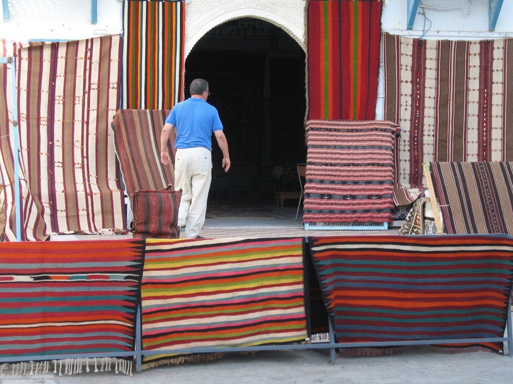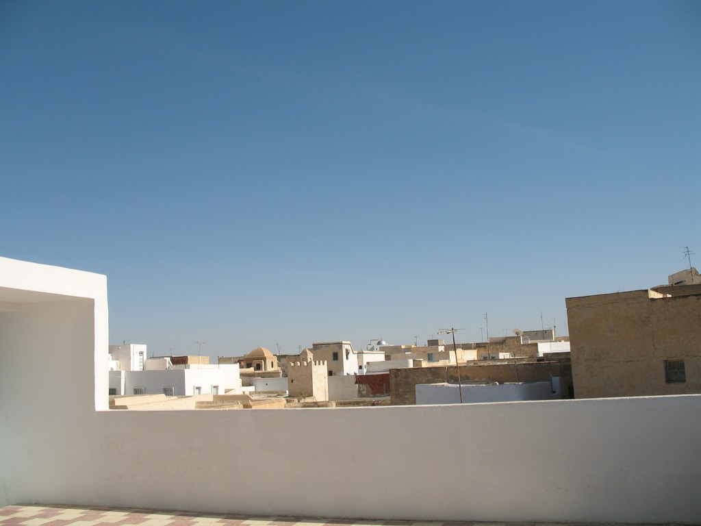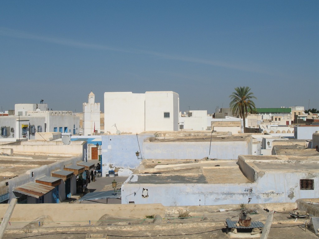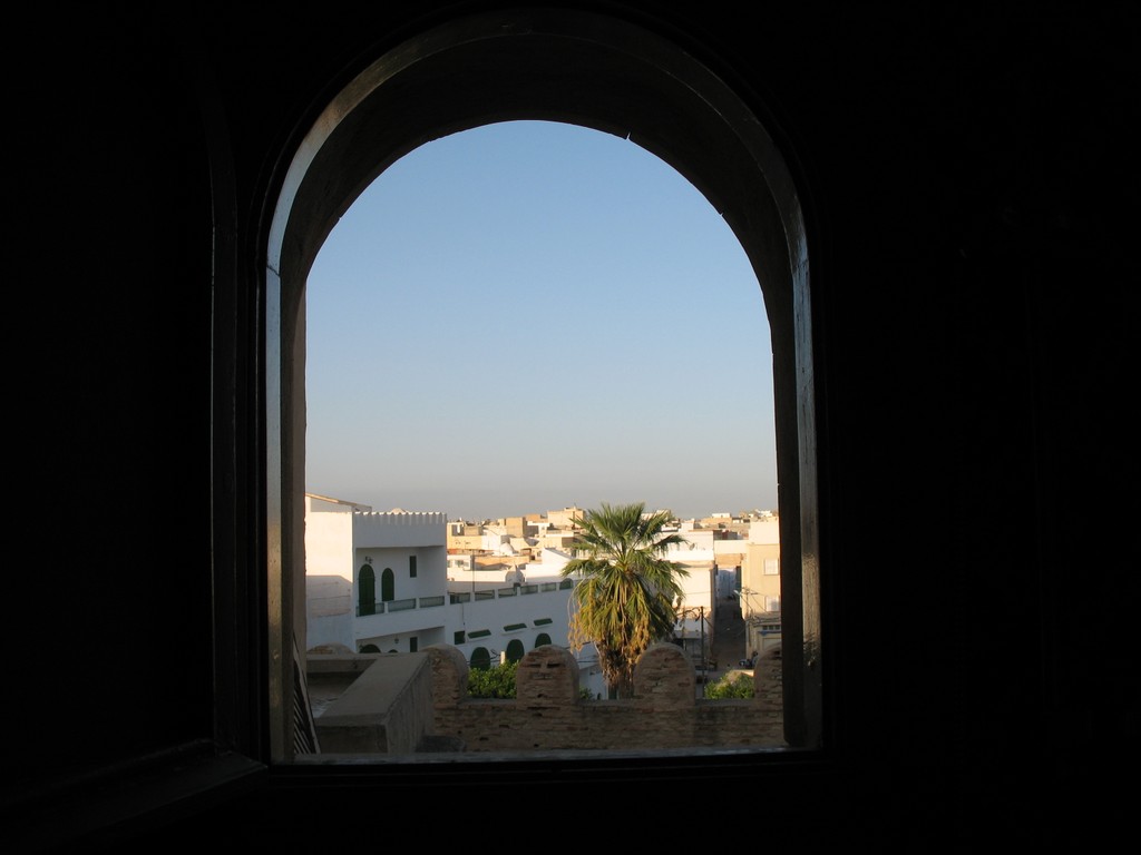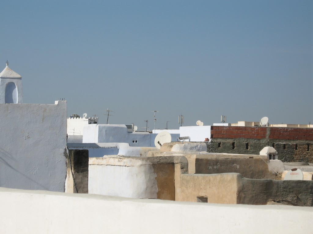 Un marchand de tapis me propose de contempler la vue depuis son toit. Je passe dans une pièce superbe, pleine de tapis, décorée d’une coupole en brique, qui reçoit sa lumière d’une galerie de fenêtres à vitres de couleurs, je grimpe dans des escaliers pleins de tapis, et je débouche, oh joie, sur une terrasse de toit somptueuse, la vue à l’infini. Il me laisse courtoisement là, seule tant que je veux pour rêver des tableaux peints par Klee dans la même lumière, dans un autre temps. Un jour seulement à Kairouan, si rempli que j’ai l’impression d’y avoir fait un long séjour…
